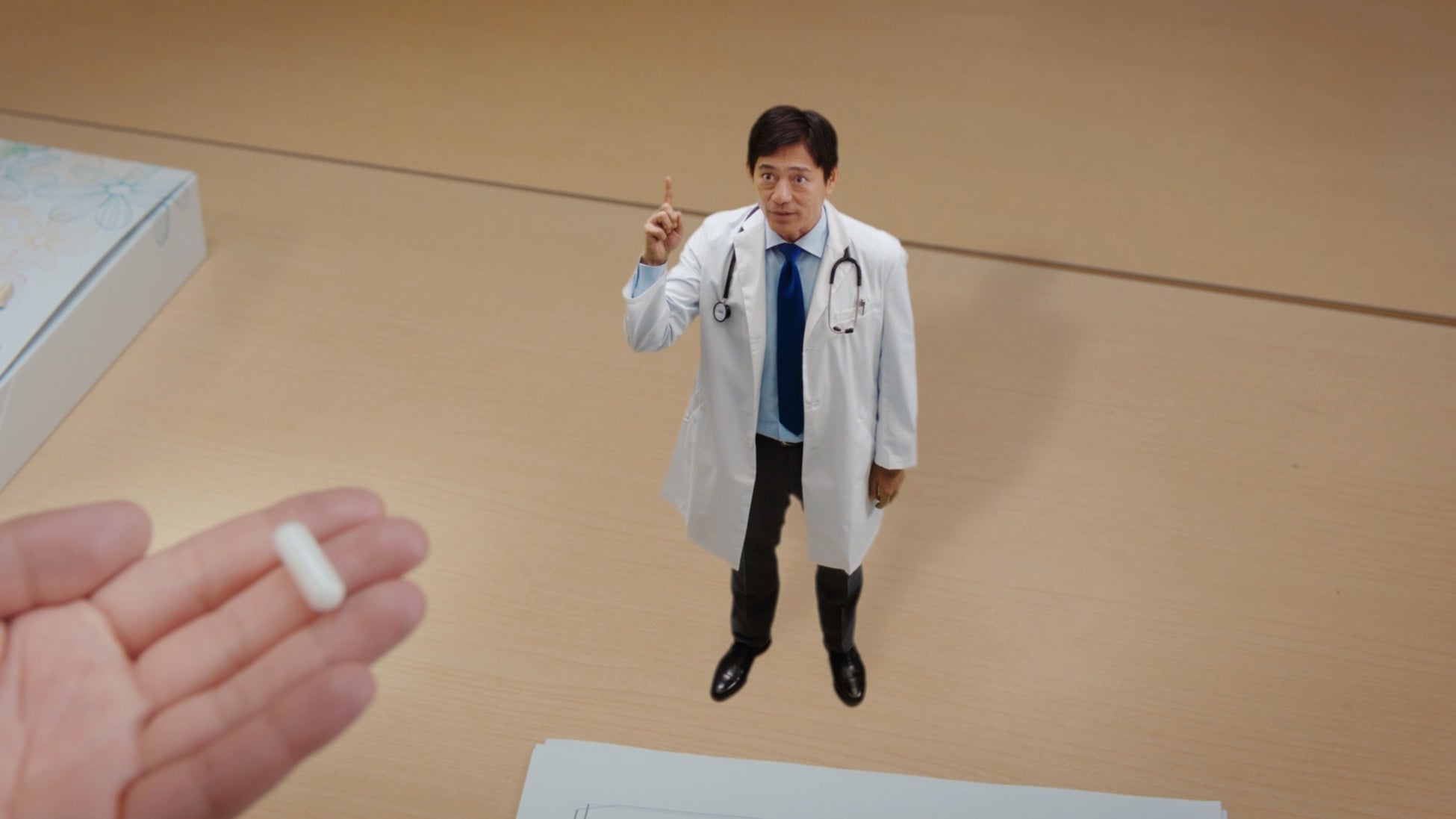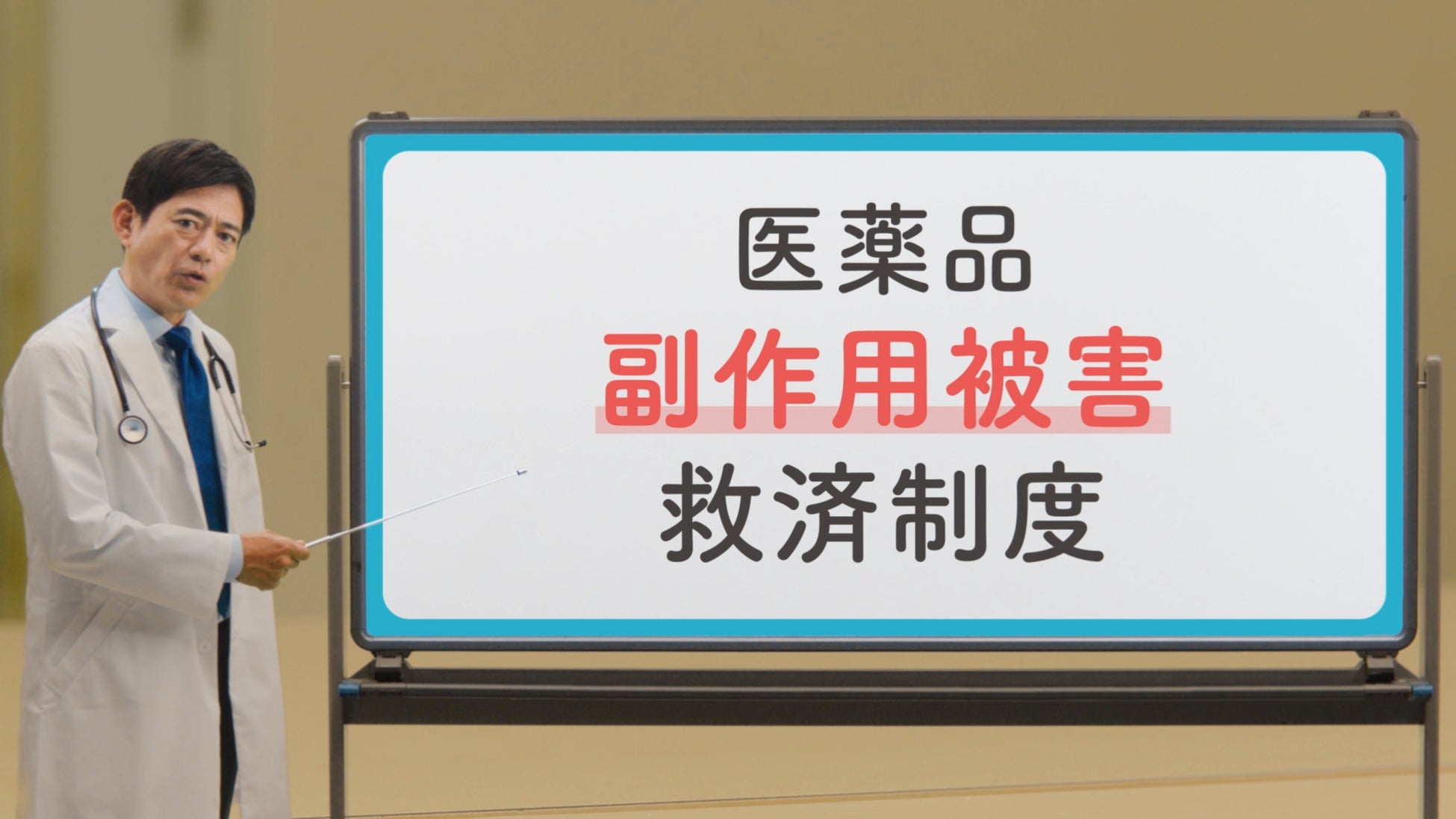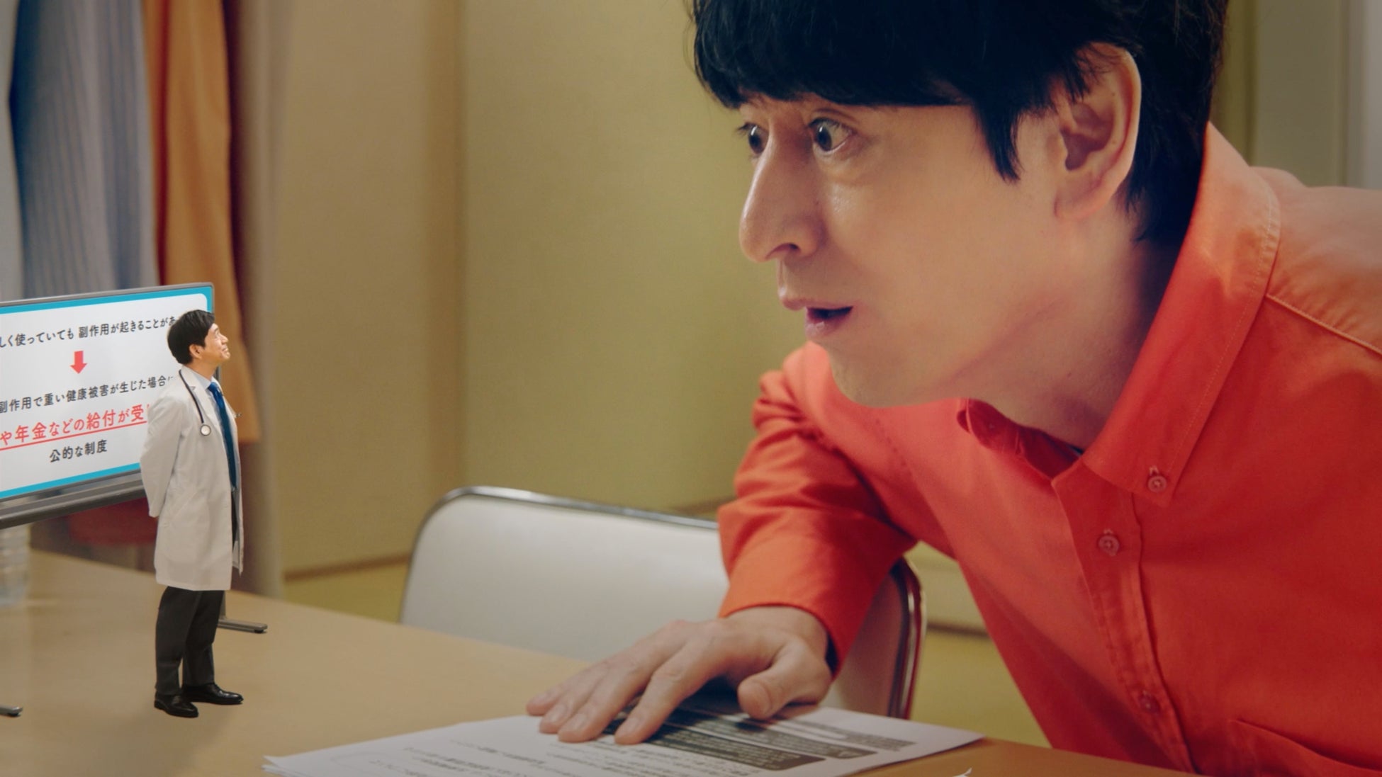 CMでは、お医者さんの格好に扮するミニ華丸さんが、楽屋で薬を飲もうとする大吉さんの前に現れ、「医薬品副作用被害救済制度」について分かりやすく解説を行なっています。