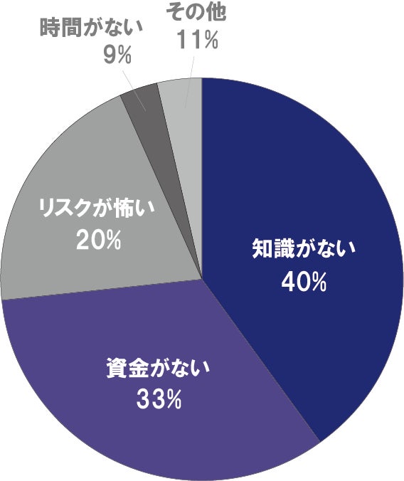 ・「投資経験のなし」と答えた人に聞いた、投資を行わない理由「知識の無さ」が40%、次いで「資金がない」が33%