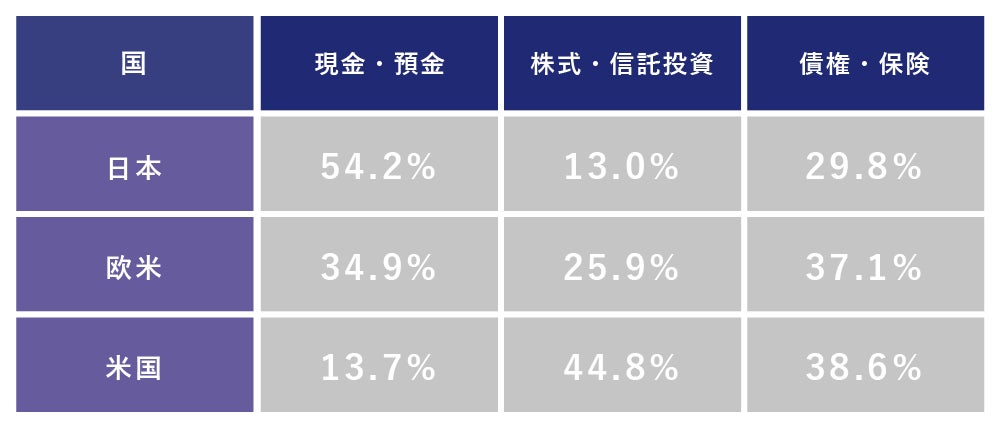 日本は現金や預金の割合が高いことに対し、欧米では株式や債券などに投資をする割合が費所に高いことが分かる。
