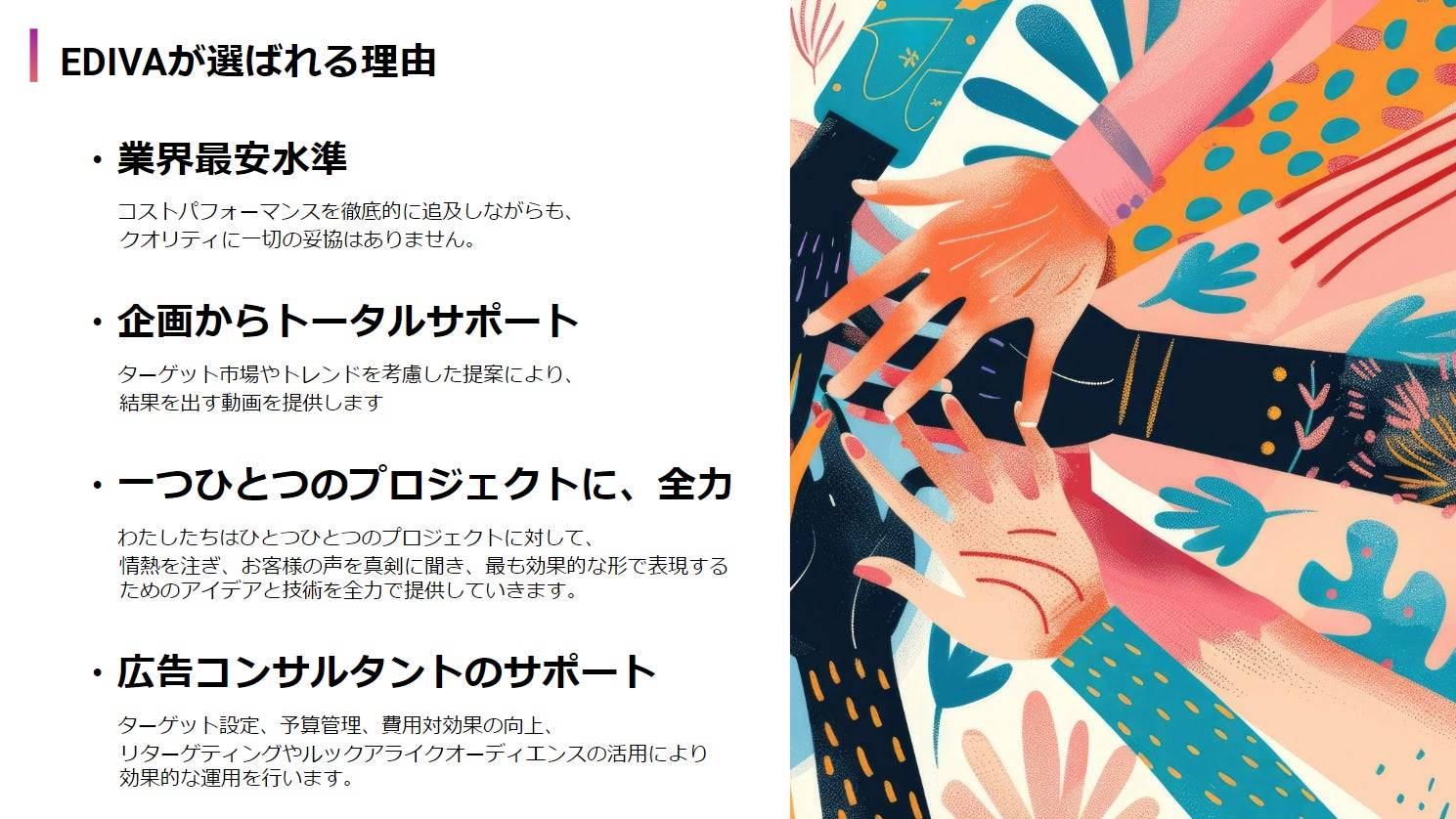 「EDIVA」は経験豊富な制作ディレクター・WEBマーケター・提携済のクリエイターが動画の企画立案から撮影、編集までワンストップで提供しています。