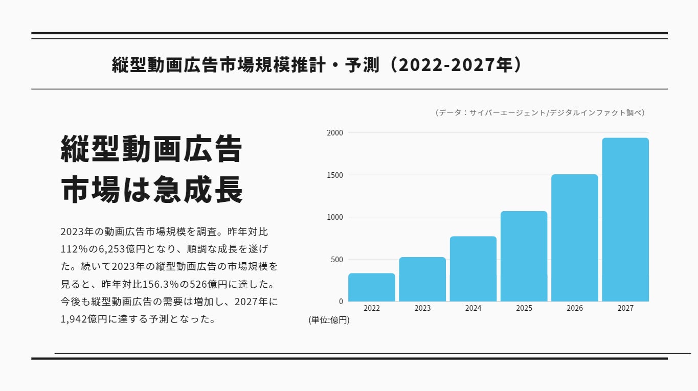2023年に動画広告市場は昨年対比112%となりました。その中でも縦型動画広告は昨対比156%と急速に拡大しています。しかし、視聴者の興味を引く演出が重要視されるため難易度が非常に高く、SNSプラットフォームのアルゴリズムやトレンドに精通している必要があります。