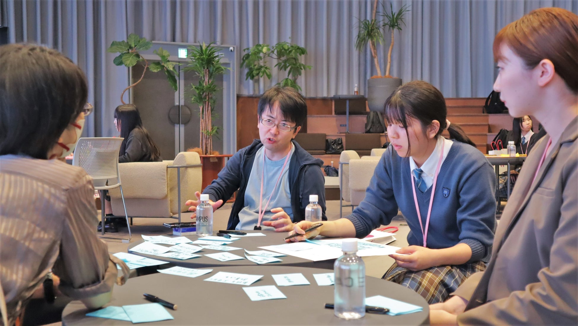 実際に体験し働き方の具体的なイメージをするために、コクヨのオフィス内のショールームにて、オフィス家具の見学を実施し、現在のオフィスイメージのインプットを行いました。その後、見学した現在のオフィスを踏まえた上で、「未来の働き方・働く場所はどうなるか」というテーマで、異なる世代で1チーム×5つ作り、各グループにて意見を出し、中高生ならではの自由な発想と社会人の知見を混ぜ合わせ、各々の考えを発表しました。発表では心と体の癒しやコミュニケーションがよりしやすい働く場としてVR、AI等のツールを掛け合わせた、斬新なアウトプットが並びました。