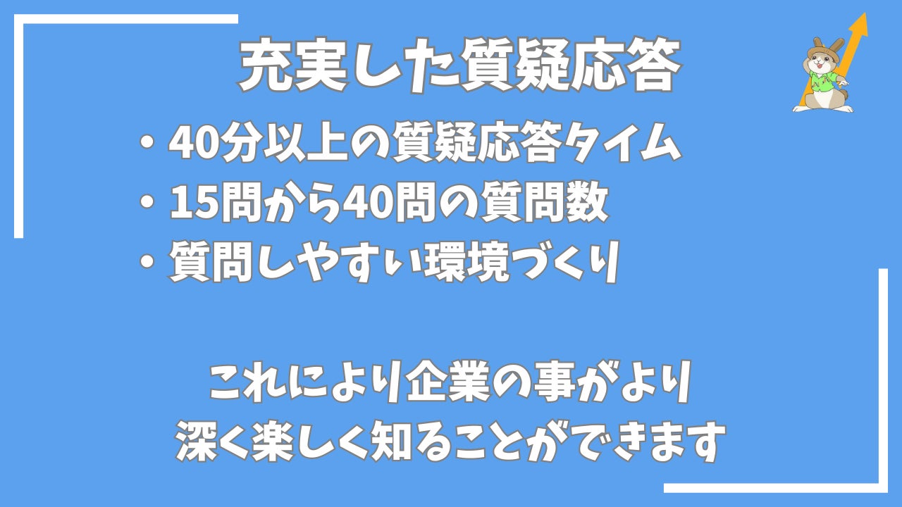 このように、企業の業績や今後の展望に関する本質的な質問から、気になった部分について深掘りしたいという質問まで、どのようなご質問も歓迎いたします。