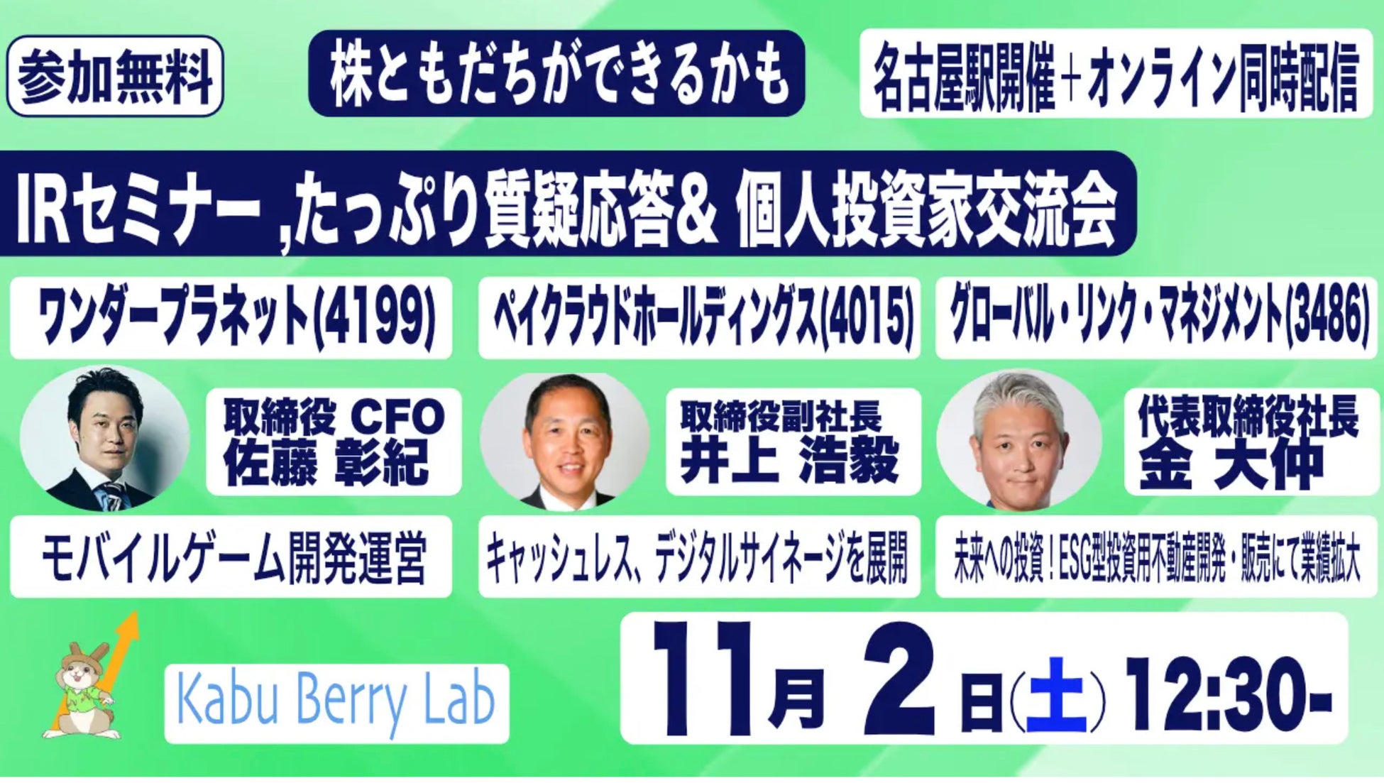 Kabu Berry Lab [ワンダープラネット(4199)・ペイクラウドホールディングス(4015) ・グローバル・リンク・マネジメント(3486)IRセミナー+投資家交流会]