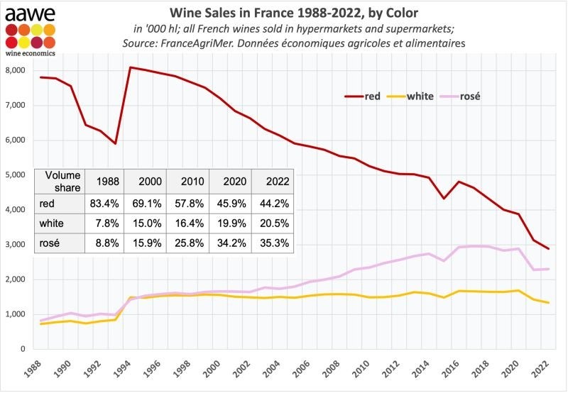 なお世界的にはロゼは大人気で、例えばフランスでは、ロゼワインの販売量は過去30年で4倍に増加し、1位の赤ワインに次いで2位、3位の白ワインの2倍ほど楽しまれています。(補足4)