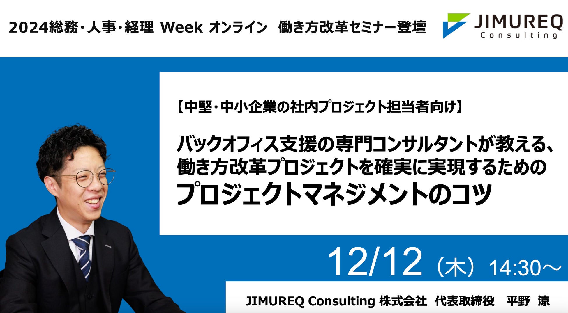 JIMUREQ Consulting株式会社(本社:東京都中央区、代表取締役:平野 涼)は、国内最大級のバックオフィス向けイベント「総務・人事・経理Week」のオンラインセミナーイベントに出展いたします。12月12日(木) 14:30より、中堅・中小企業の社内プロジェクト担当者様向けに、働き方改革プロジェクトを成功させるためのプロジェクトマネジメントのコツをお話いたします。