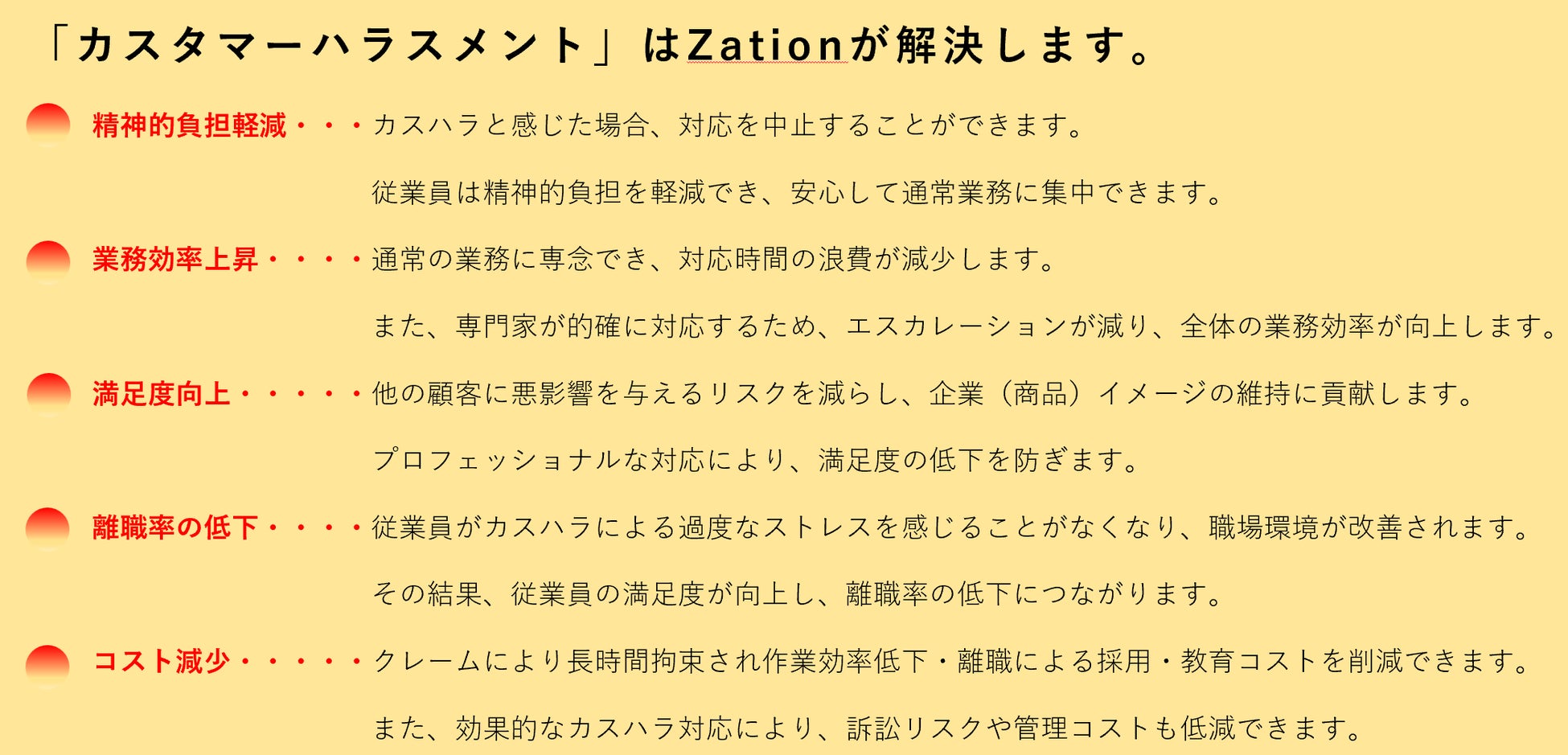 カスタマーハラスメント(カスハラ)は、特にサービス業やコールセンターにおいて深刻な問題となっており、従業員のメンタルヘルスや企業全体の生産性に悪影響を及ぼしています。長時間の拘束や不当な要求に苦しむ従業員を保護し、業務効率を向上させるため、Zationは「カスハラ代行窓口サービス」を提供します。