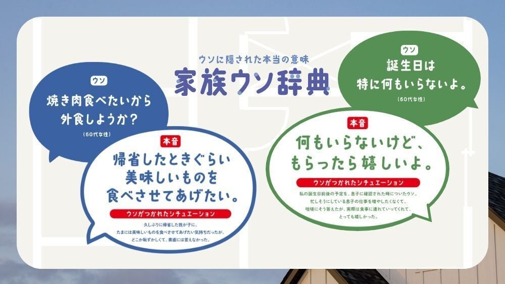 心配させたくない、迷惑かけたくない...。家族の会話には、案外ウソが隠れているものです。この展示では、実際に集めた”家族についたウソ”と、そのウソに隠された本音を展示しています。あなたの家族のウソも隠されてるかもしれません。