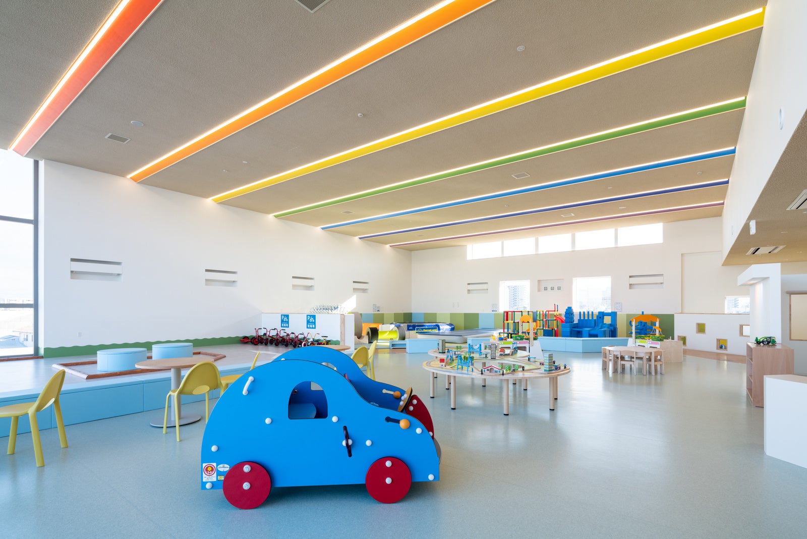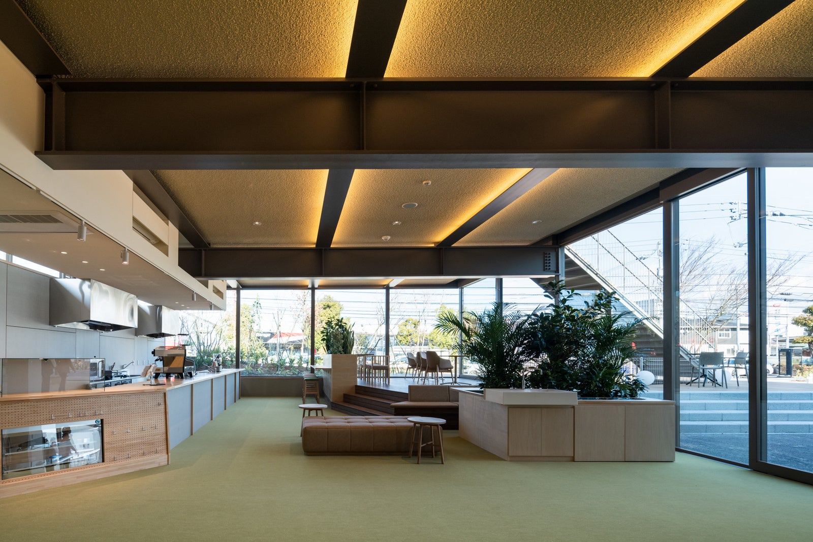モビリティ社会の変革を見据え、単に車を売るだけでなく「愛媛の人々を繋ぎ、地元の可能性を広げ、地域繁盛を目指す」という目標を掲げるクライアントと共に、大きな屋内キッズスペースや無料開放のホール、コワーキングスペースやカフェなどを備えた複合施設としてこれまでにないショールームの形を模索したカーディーラーの新店舗である