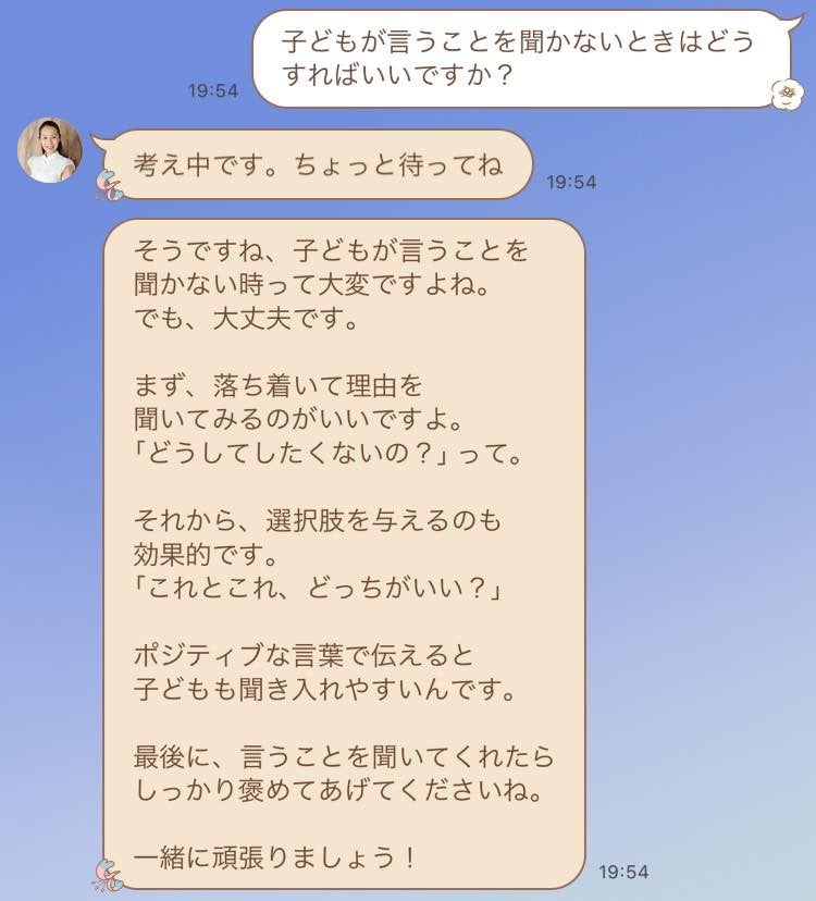 気軽に相談できる相手がいない時に、ママたちの心のパートナーとして寄り添います。専門家の意見を取り入れたアドバイスを受けることで、日々の子育てにおいて直面する様々な課題をよりスムーズに解決できるヒントになります。また、ちょっとした疑問や不安、お子さんのモチベーションアップの仕方や寄り添い方など、その場で解消できるため、子育てを頑張っている親御さんの心をそっと支えて応援いたします。