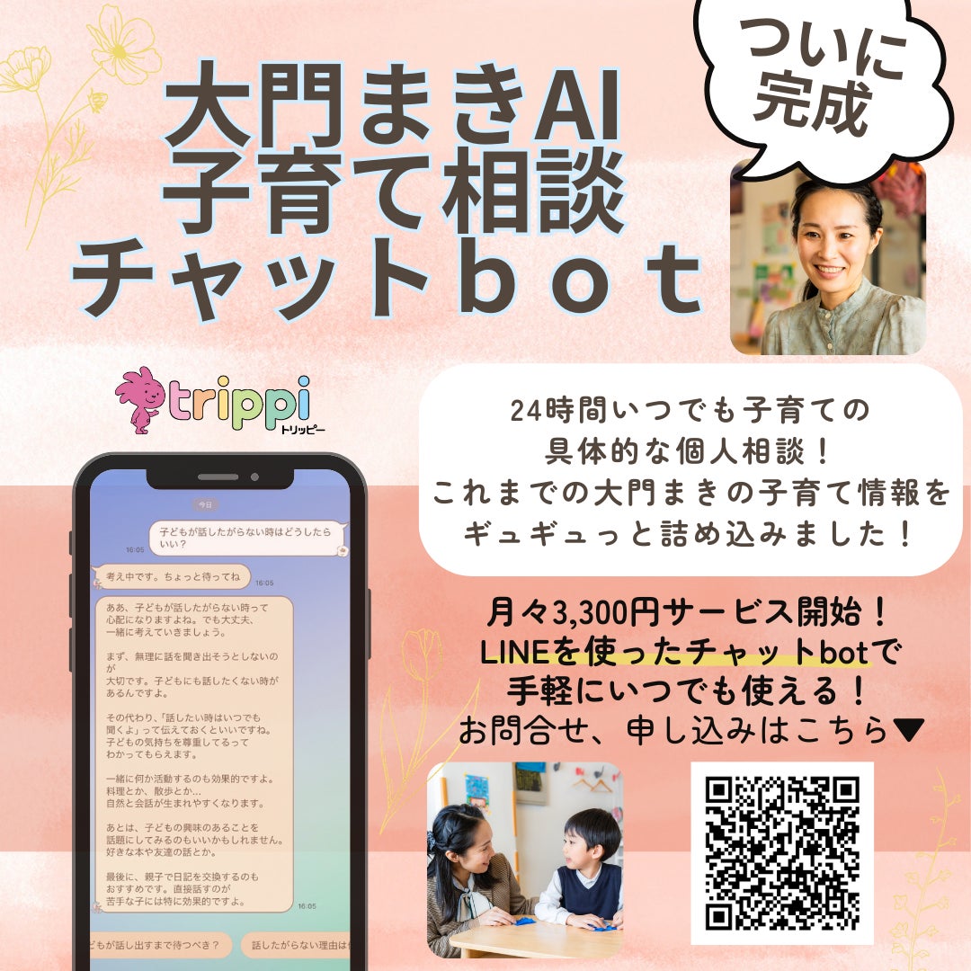株式会社trippi(トリッピー表現力教室)は、子育て中のママの心強い味方となる「大門まきAI 子育て相談チャットボット」を12月1日にリリースいたしました。