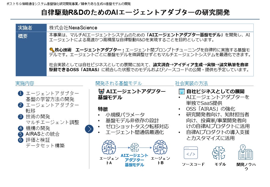 NexaScienceが本事業において開発する「AIエージェントアダプター」は、この課題を解決するための基盤モデルです。AIエージェント間のコミュニケーション(プロンプト)を自律的に最適化する「アダプター」を介在させることで、基盤モデルの再学習を必要とせずに、システム全体の性能を改善します。これにより、研究開発から事業化に至るまでの一連のプロセスにおいて、複数のAIが協調して自律的に駆動する世界の実現を目指します。