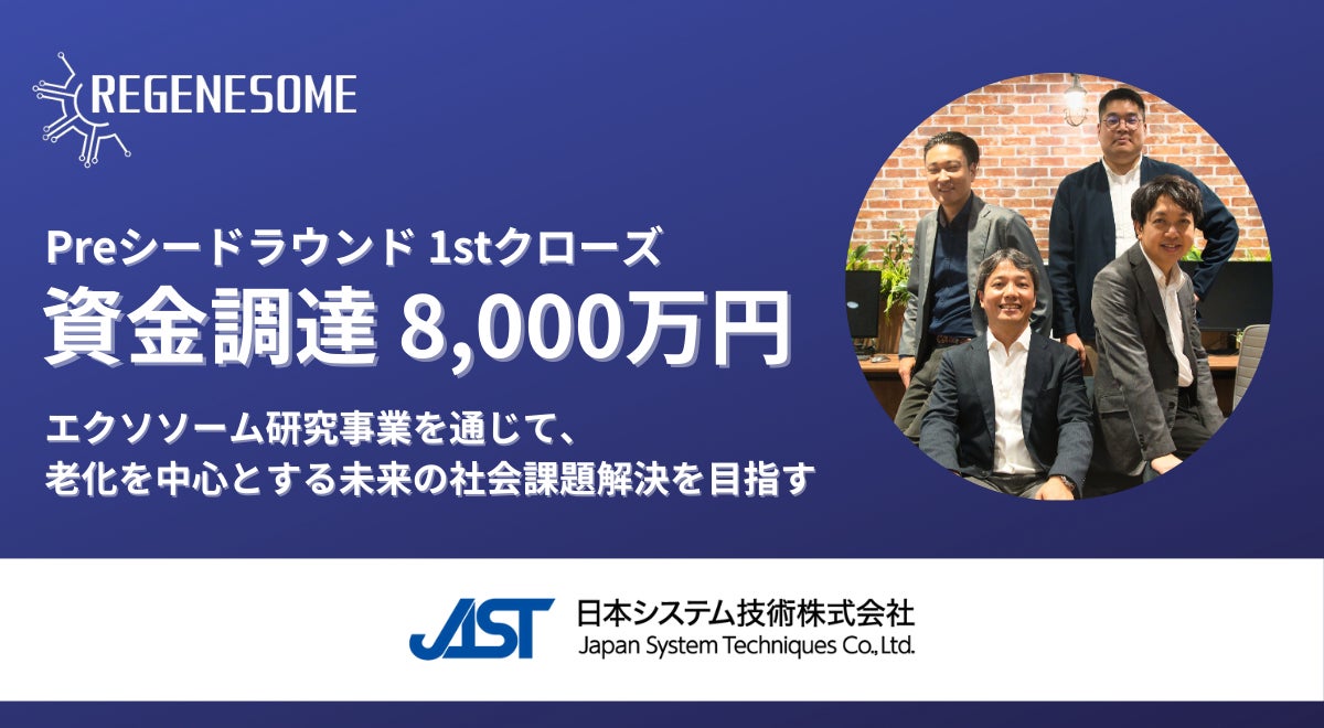 リジェネソーム株式会社(本社:東京都港区、代表取締役CEO:鈴木 健吾、代表取締役社長:佐久間 善太郎、以下「リジェネソーム」)は、日本システム技術株式会社(本社:大阪市北区、代表取締役社長:平林 武昭、以下「JAST」)を引受先としたJ-KISS型新株予約権の発行により、Preシードラウンドにて総額8,000万円の資金調達を実施いたしました。リジェネソームではこれを1stクローズとし、金融機関等からの融資による追加的な調達も進めてまいります。