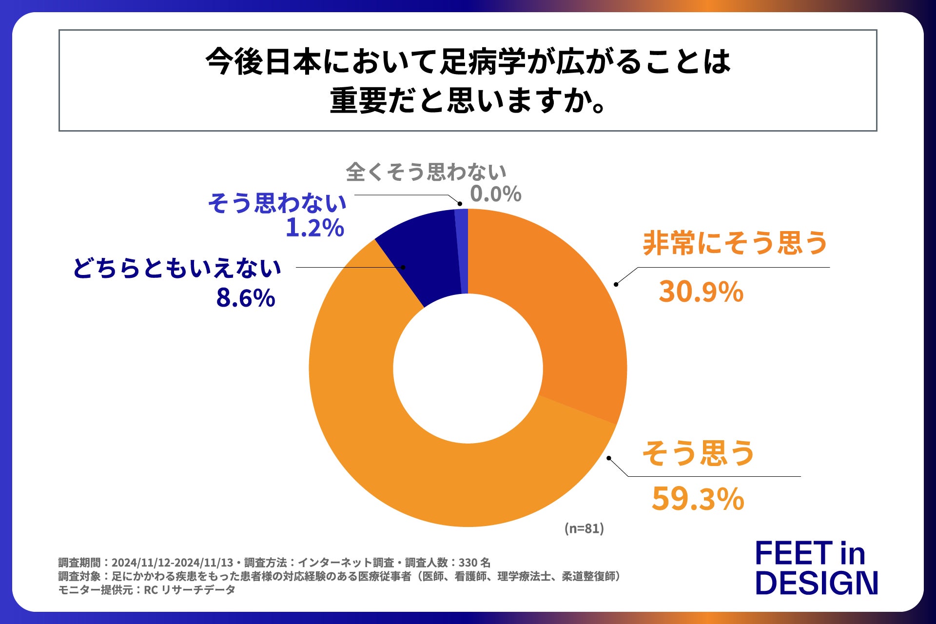足病とは足にかかわる疾患を指し、それを総合的に診るのが足病学です。米国では足潰瘍や足部変形、巻き爪などの足の症状を専門的に診る専門医として「足病医(podiatrist)」が活躍しています。また、フットヘルスが維持されると外出機会は増加し、運動量の減少も抑えられ、サルコペニアやフレイルの予防にもつながります。そのため、超高齢社会の日本において今後足病学の浸透は必要不可欠とも言えます。しかし、日本におけるその認知度は十分とはいえない状況があります。米国で治療に用いられている高機能オーダーメイド足装具『ORTHOTICS(オーソティクス)』を提供する株式会社フィートインデザインは、一般の方より健康に関する情報感度が高い医療従事者の方を対象に「足病学」についてどれ位の認知があるかを明らかにすべく、調査を実施しました。