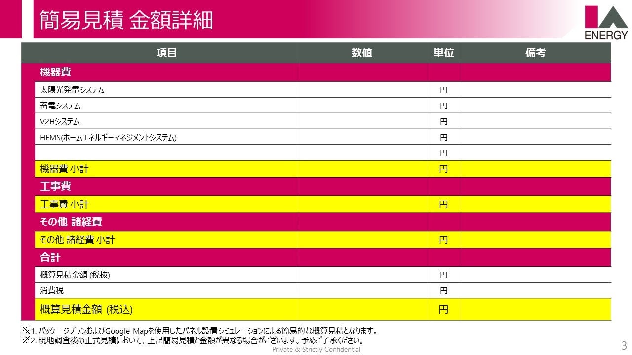 パネル枚数や年間発電量、概算の設置費用をご提出いたします。