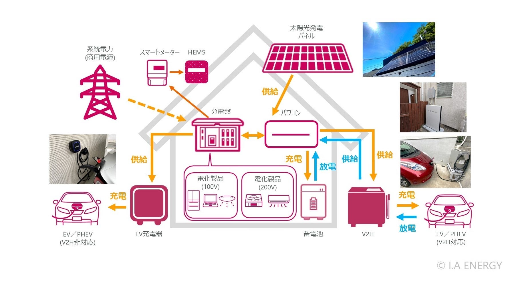 V2H: EVのバッテリーを家庭用電力として利用可能、停電時のバックアップ電源として活用。