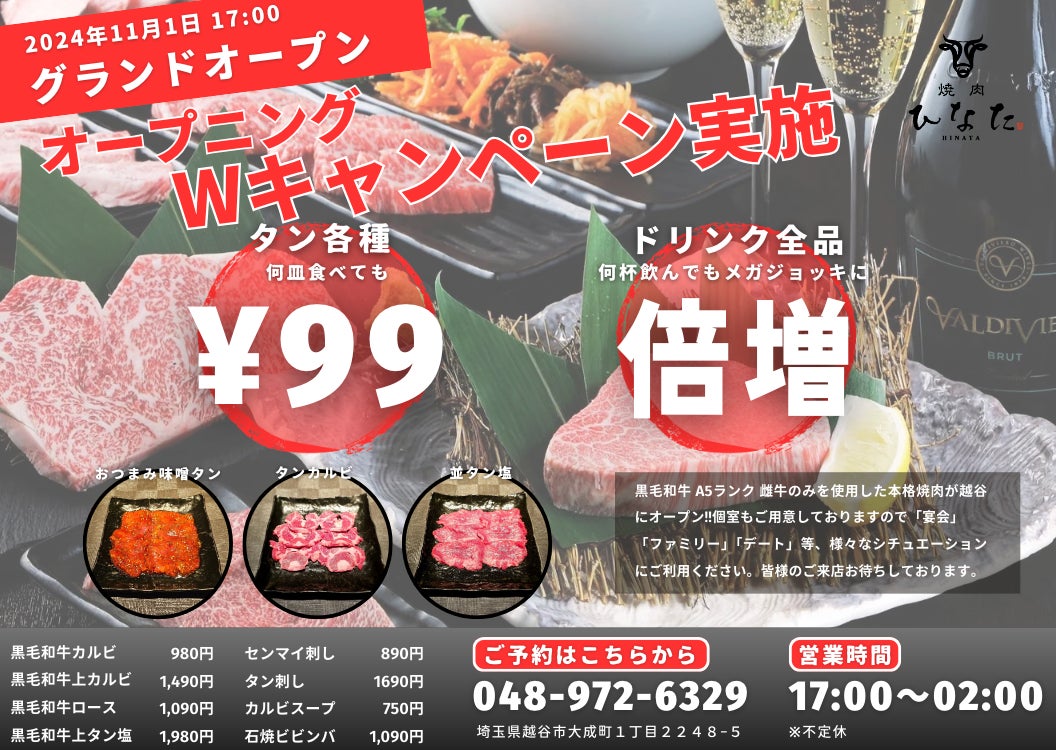 焼肉ひなた グランドオープン!! タン各種¥99 / ドリンク全品倍増「食べ尽くして、飲み尽くす!!」Wキャンペーン開催!!