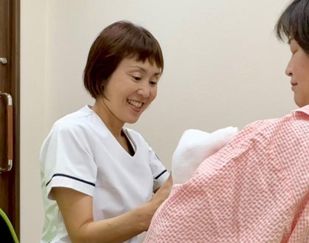 10人の助産師を主導するのが看護師長の赤羽洋子助産師です。赤羽助産師は看護大学教員時代に妊婦を対象としたフットマッサージの研究を行っていました。菜の花マタニティクリニック開院を機に臨床へ復帰し、「フットマッサージは産褥期にも不安軽減、入眠促進の効果が高い」というエビデンスに基づき(Domínguez-Solís et al, 2021; Owais et al, 2018)、産後の入院患者全員に毎日フットマッサージを施行しています(ステップ6)。