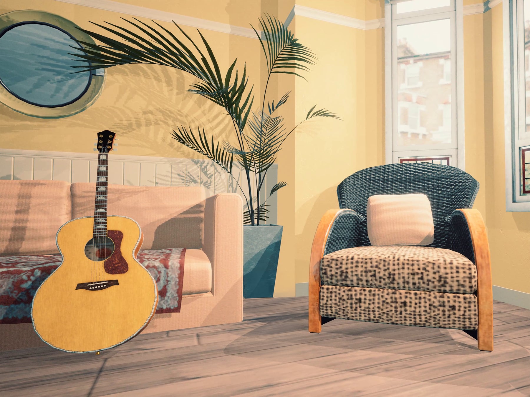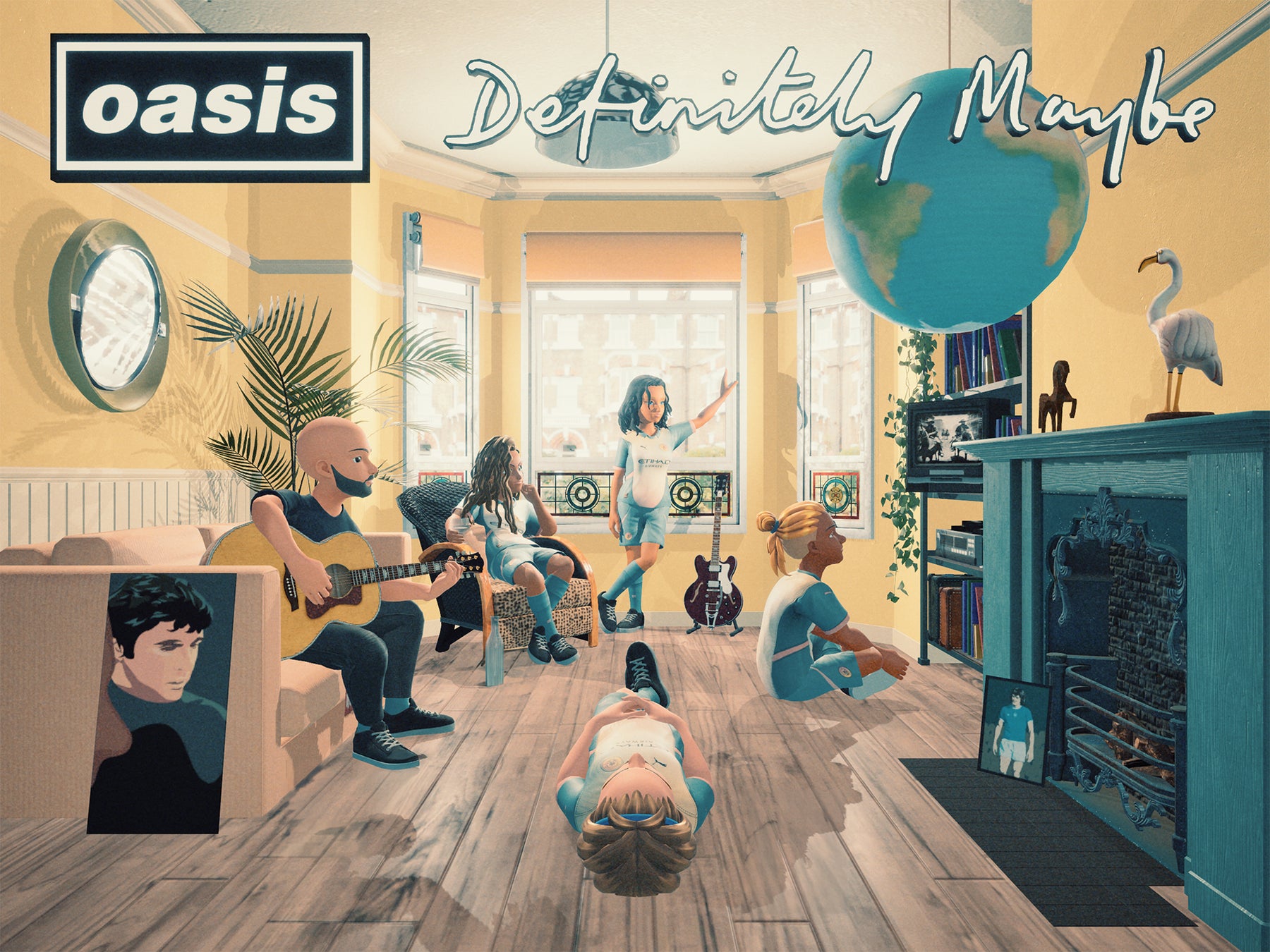 初期メンバーであるボーンヘッドの自宅リビングで撮影されたデビュー・アルバム『Definitely Maybe』のジャケットを、自身を投影したアバターで再現できます。