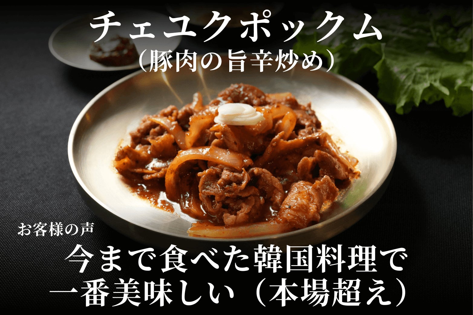 ②チェユクポックム(豚肉の旨辛炒め)は、韓国本場で日常的に食べられている人気の炒め料理です。きむ兄弟が何年も時間をかけ、何百回と味の調整をして仕上げた至極の一品です。チェユクポックムはサンチュで巻いてお食べください。