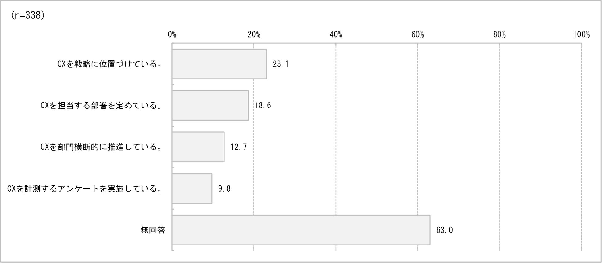 企業の74.6%がCX(顧客体験価値)に関心を示す一方、実際の取り組みは限定的であり、戦略的推進の余地が大きい。
