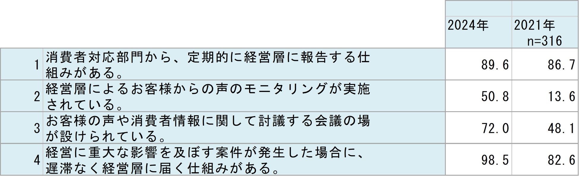 企業における消費者志向経営の取り組みが深化し、「お客様の声のモニタリング」や「消費者情報を討議する会議」の導入が進み、経営層と現場の連携が大幅に促進された。