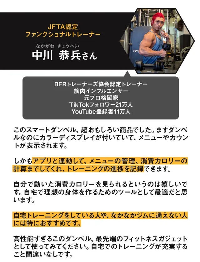 日本のフィットネス市場はまだまだ発展途上ですが、このスマートダンベルが多くの人々にとって運動を続けやすくする大きなきっかけになると確信しています。忙しい方でも、家庭で短時間で効果的なトレーニングを行い、健康的でスマートな生活を実現できる商品です。フィットネスの敷居を下げ、もっと多くの方に健康を手にしてほしいと願っています。