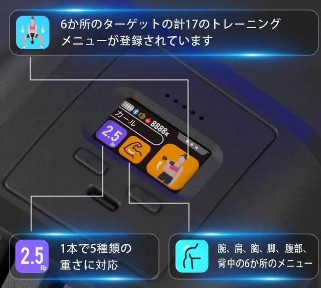 可変式スマートダンベルの革新性:1本で5段階の重さ(1.1kg・2.3kg・3.4kg・4.5kg・5.7kg)に簡単に調整可能なダンベルは、子供からシニアまで幅広い年齢層に対応。さらに、トレーニングデータの自動カウント機能やアプリ連携により、トレーニングの可視化が可能です。ランキング機能を通じて、他のユーザーとの競争や達成感も得られ、飽きずに続けられる仕組みです。