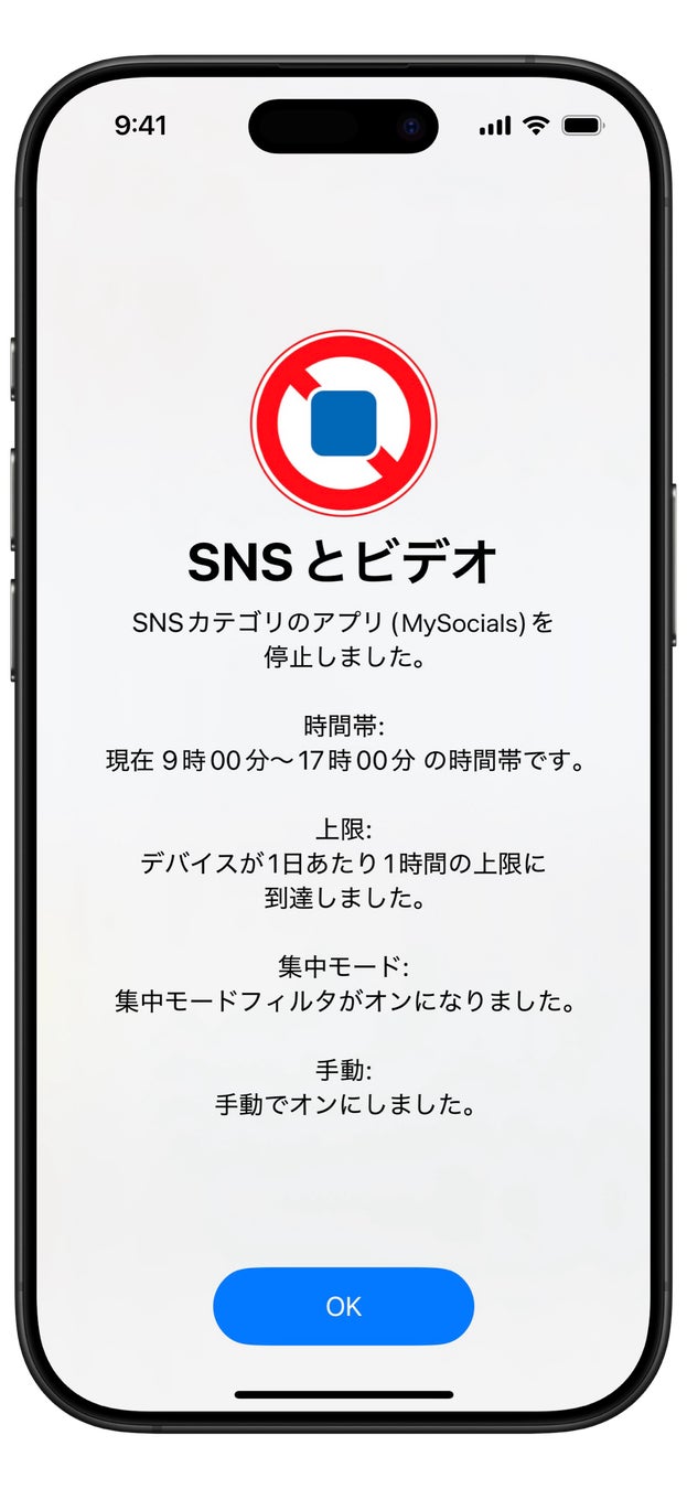 このブロック画面は、閉じるための「OK」ボタンしか表示しない設計のため「あと15分だけ...」と延長ボタンを何度も押して、結局は終日制限をオフにしてしまうような事にはなりません。