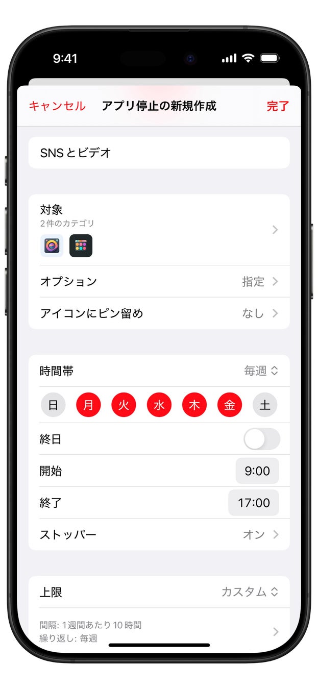 「時間帯」機能には、アプリをずっとブロックし、例外的に決めた時間だけアプリを利用可能にするための「時間帯にストッパーをオフ」オプションを、「上限」機能には少し長めのスパンで利用時間をコントロールしたい場合のための「1週間あたり」のオプションを用意しています。