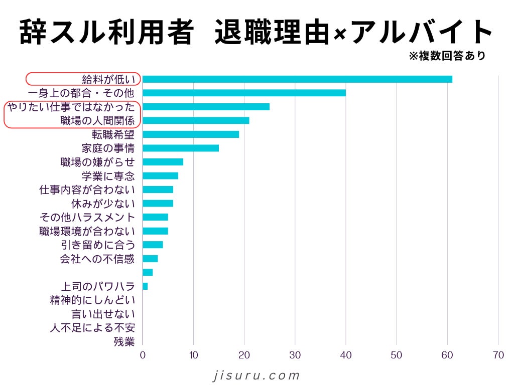 アルバイトの方の退職理由を見ると、「給料が低い」が最も多い結果でした。