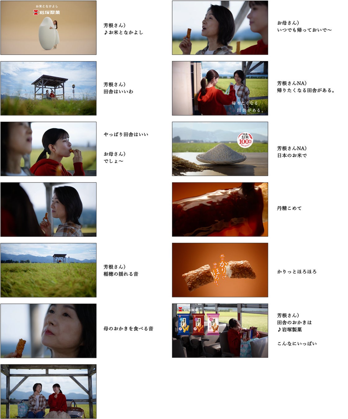 『帰りたくなる田舎がある』篇は、おいしそうに「田舎のおかき」を食べる姿と母娘の会話劇を通じ、誰にでも共通するほっとする場所としての田舎のイメージと「田舎のおかき」の“ほっとする”おいしさを重ね合わせ、エモーショナルな世界観の中で「田舎のおかきはいい」というイメージを表現しています。