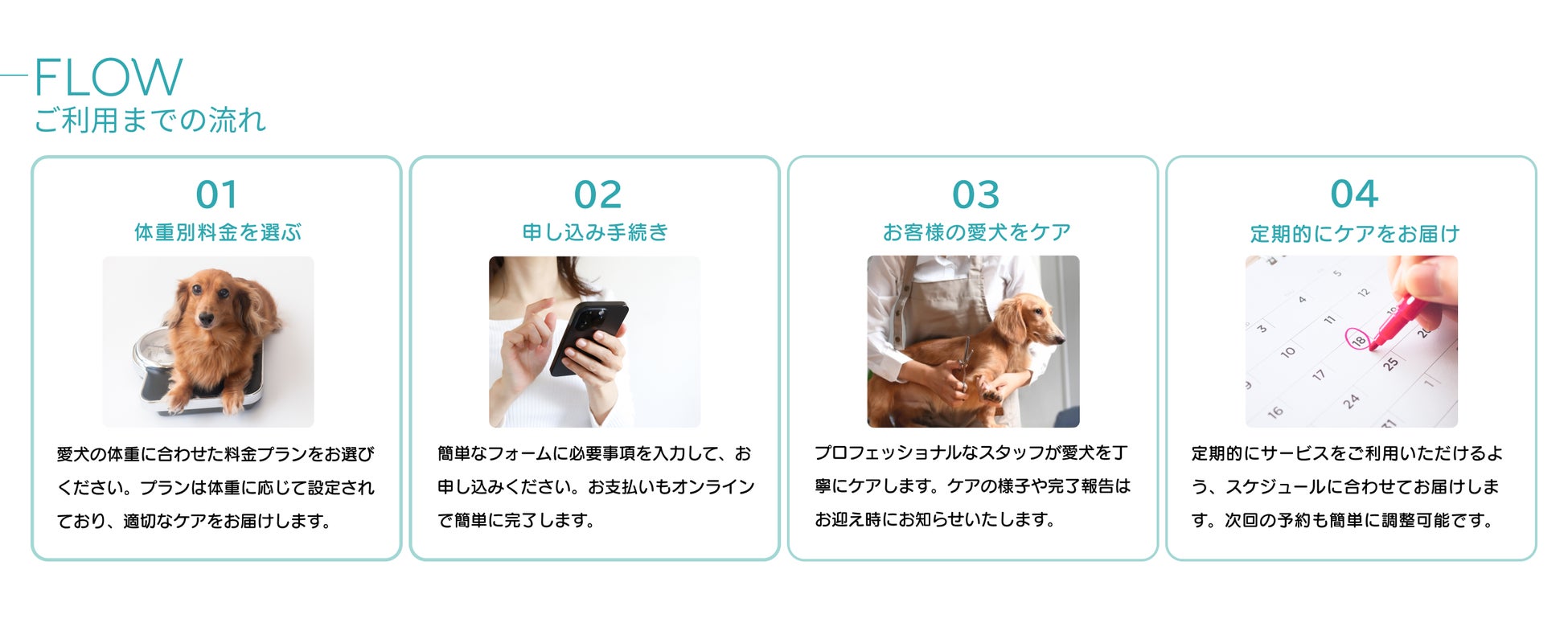 導入までの流れは、簡単な4ステップです。まず、スマホやパソコンから愛犬の体重に合わせて料金プランを選びます。次に、簡単なフォームに必要事項を入力して申し込みを完了し、お支払いもオンラインでスムーズに行えます。お申込み後、サブスクメンバーには、会員カードをお渡しします。その後、プロのスタッフがわんちゃんを丁寧にケアし、ケアが完了した際にはお迎え時にご報告いたします。予防薬はクリニック・ドッグサロン らしくらにてお渡し可能。健康診断は予約制となり、ご予約はクリニック・ドッグサロン らしくらにて承ります。また、カフェでは会員カードの提示でわんちゃんと飼い主さまの特典が受けられます。