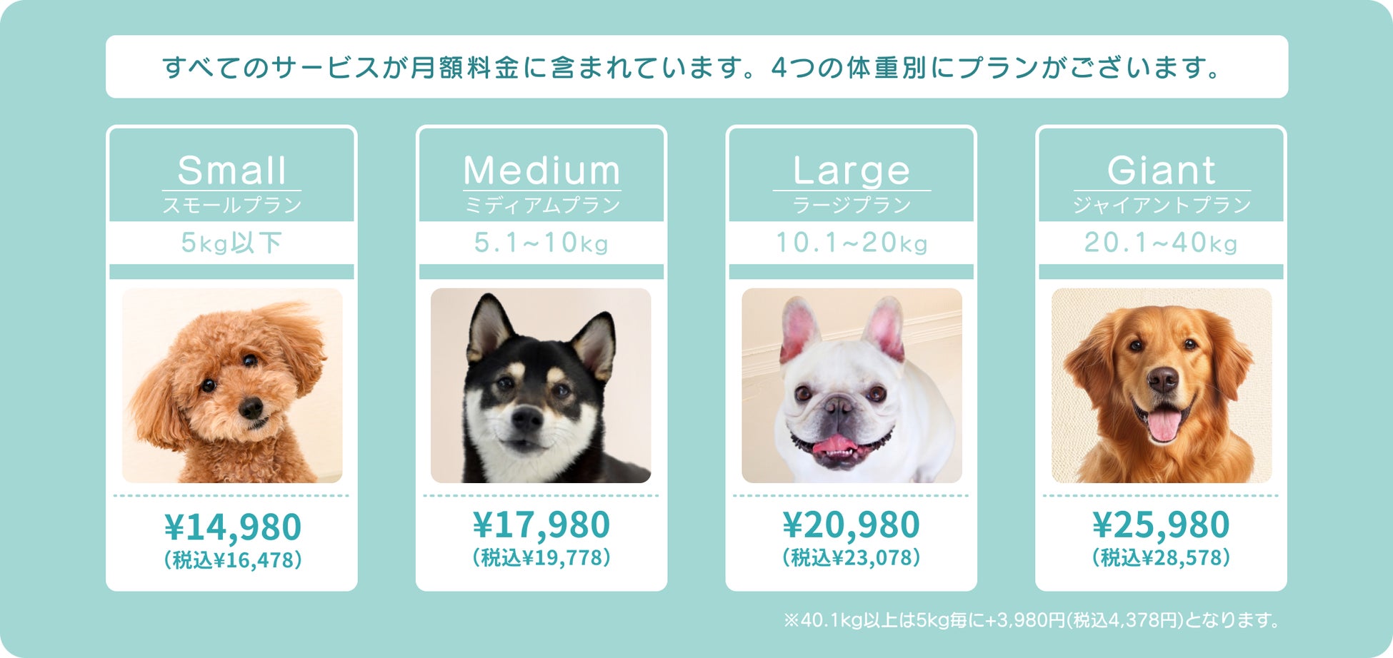 「らしくらのサブスク」では、愛犬の体重に応じた4つのプランをご用意しています。体重5kg以下の愛犬にはスモールプラン「14,980円/月(税抜)」、5.1kg〜10kgにはミディアムプラン「17,980円/月 (税抜)」、10.1kg〜20kgにはラージプラン「20,980円/月」、20.1kg〜40kgにはジャイアントプラン「25,980円/月」をご利用いただけます。すべてのプランにはトリミングや健康ケアなどのサービスが含まれており、愛犬の体重に合わせた最適なケアをご提供します。
