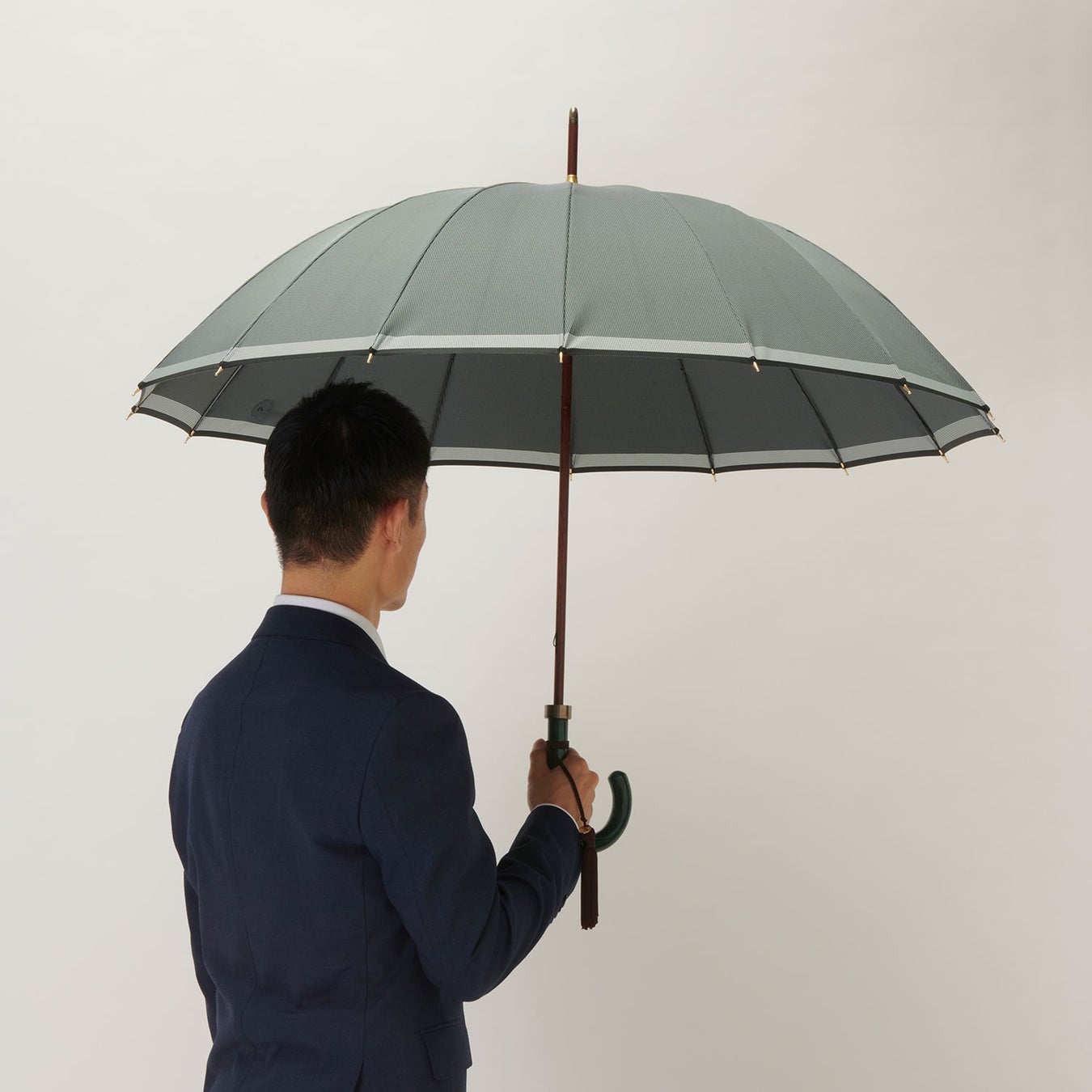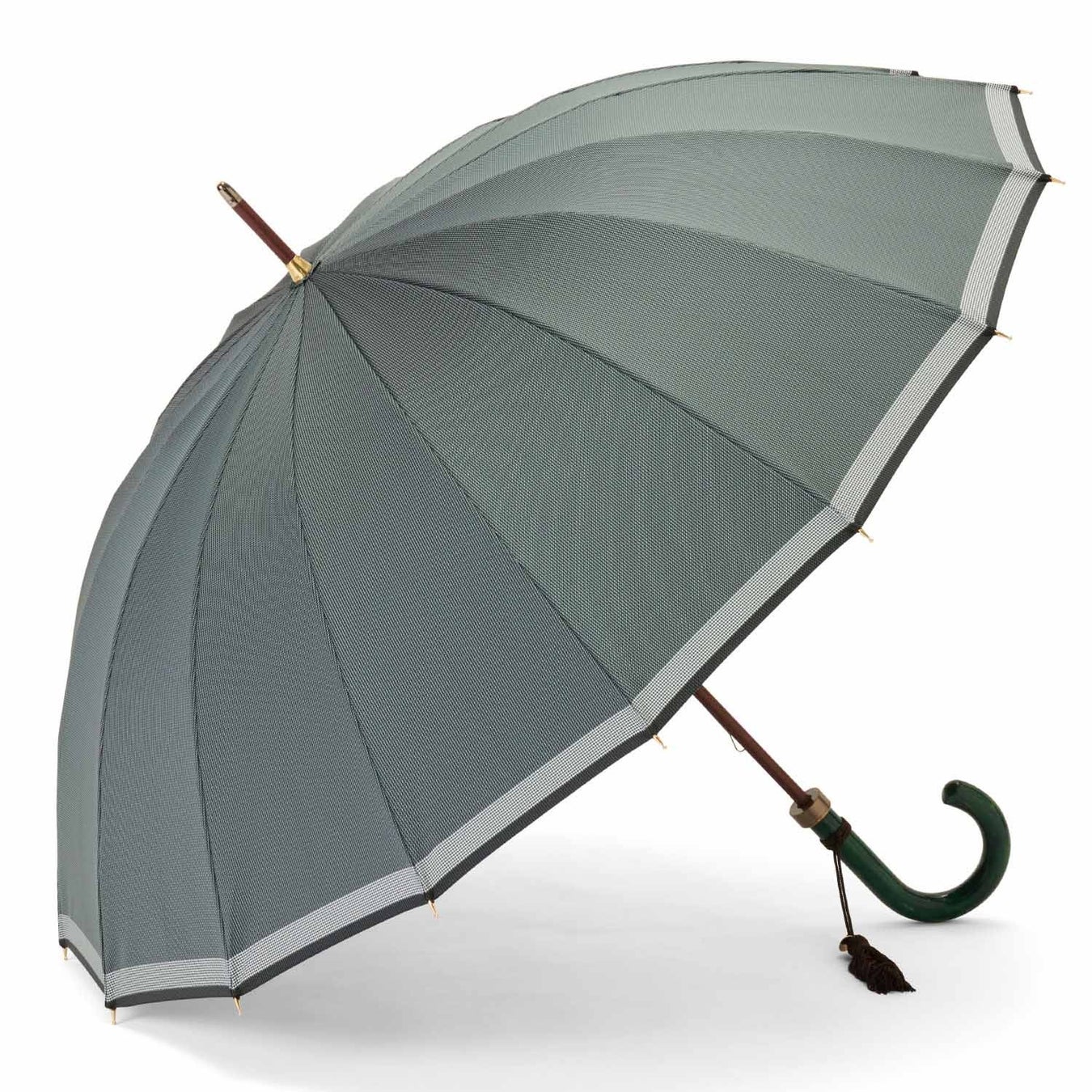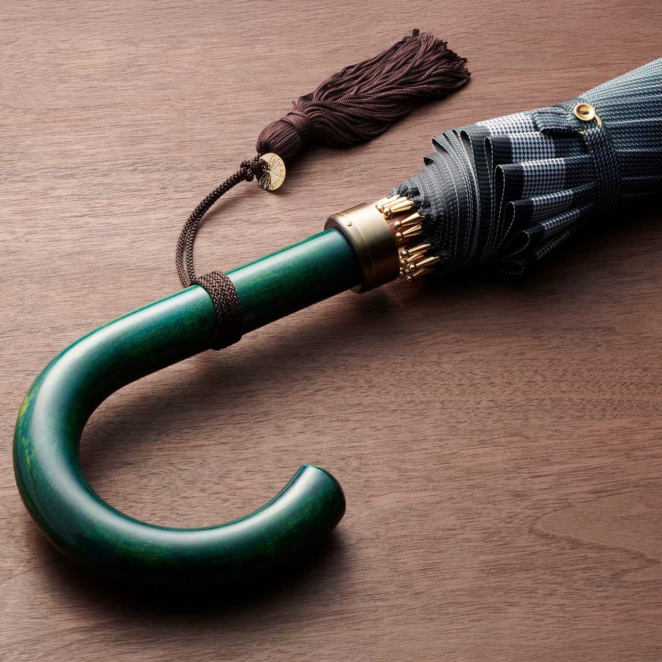 深いグリーンが印象的なメンズ傘は、60㎝×16本骨。縁部分を細かい千鳥格子がめぐるクラシカルな一本です。
