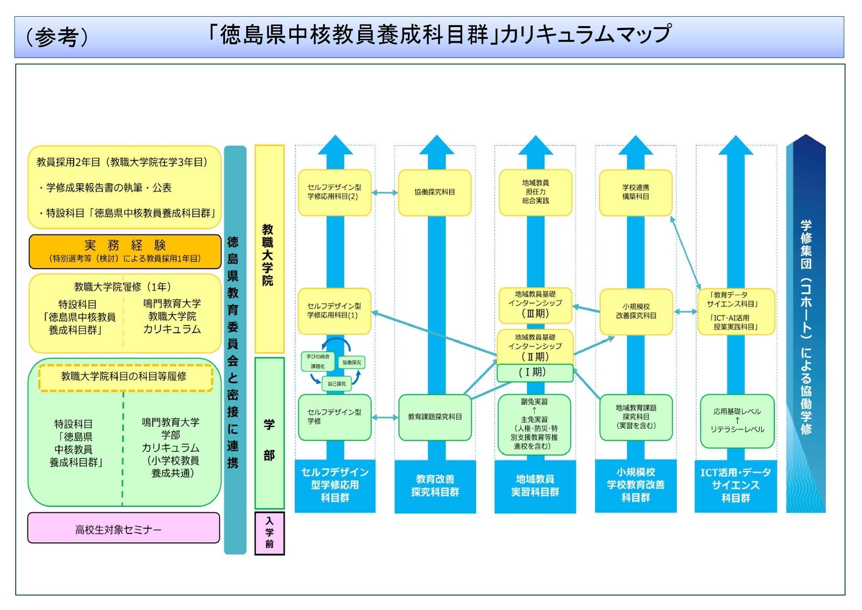 これらの力量を確実に修得させるために、学部・教職大学院を通して特設科目「徳島県中核教員養成科 目群」を設定するとともに、地域教員希望枠学生(5名)のコホートによる協働学修をベースに学部・教職大学院接続インターバル型履修によるカリキュラムを展開します。