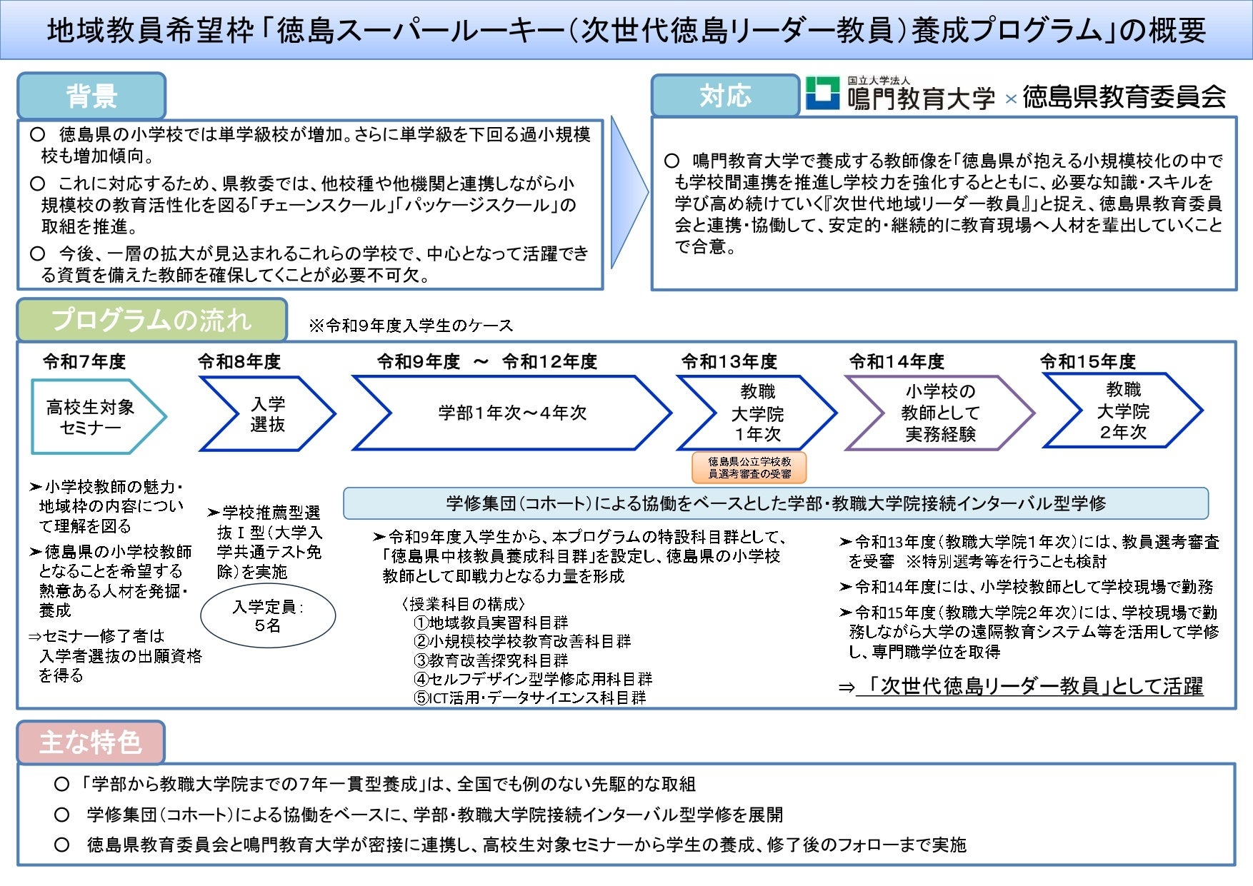 今後、令和9年度入試(令和8年度実施)から、県内外を問わず徳島県の小学校教師を目指す強い意欲を持った学生を「地域教員希望枠」として募集します。「地域教員希望枠」で入学した学生は、鳴門教育大学と徳島県教育委員会が連携開設する「徳島スーパールーキー教員養成プログラム」により、即戦力となる知見・力量を獲得します。