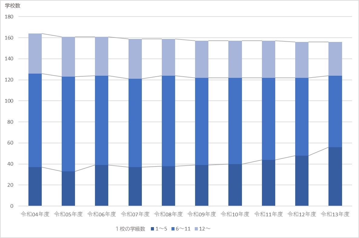 徳島県では、この10年間(平成25年度~令和4年度)で小学校に在籍する児童数は4,643人減り、約12%の減少となりました。この傾向は今後加速化し、令和12年度には現在の19.5%の減少となることが予測されています。その帰結として、小学校について言えば、全県的に再編統合により学校数が減少しています。一方で、児童の通学の難点等の理由で再編統合にも限度があることから、小学校の小規模化が進行し、県内全域に小規模小学校が点在する状況が想定されています。