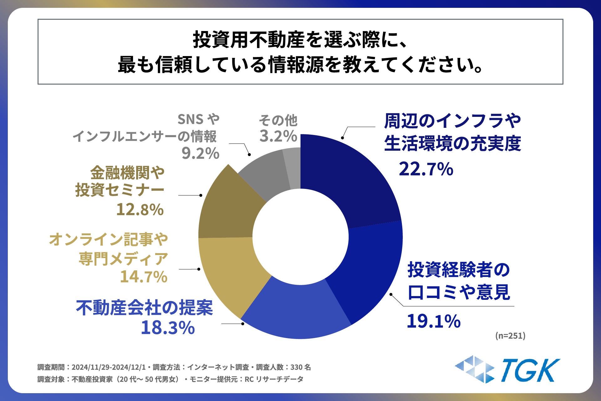 調査の最後、不動産投資で収益が上がっていると回答された方に「投資用不動産を選ぶ際に、最も信頼している情報源は何か」を尋ねる設問の回答で多かったのは、1位が「周辺のインフラや生活環境の充実度」で22.7%、2位が「投資経験者の口コミや意見」で19.1%、3位が「不動産会社の提案」で18.3%という結果になりました。この結果から、投資用不動産を選ぶ際に情報源として最も信頼されているものは「周辺のインフラや生活環境の充実度」であることが判明しました。