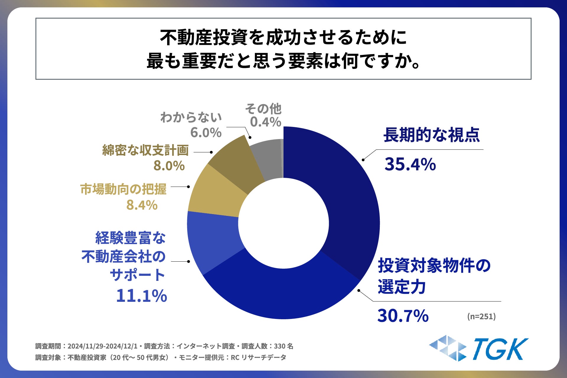 また、不動産投資で収益が上がっていると回答された方に「不動産投資を成功させるために最も重要だと思う要素は何か」を尋ねる設問の回答では、1位が「長期的な視点」で35.4%、2位が「投資対象物件の選定力」で30.7%という結果になりました。この結果から、収益を上げている不動産投資家が不動産投資を成功させるために重要な要素は「長期的な視点」と「投資対象物件の選定力」だと考えていることがわかりました。