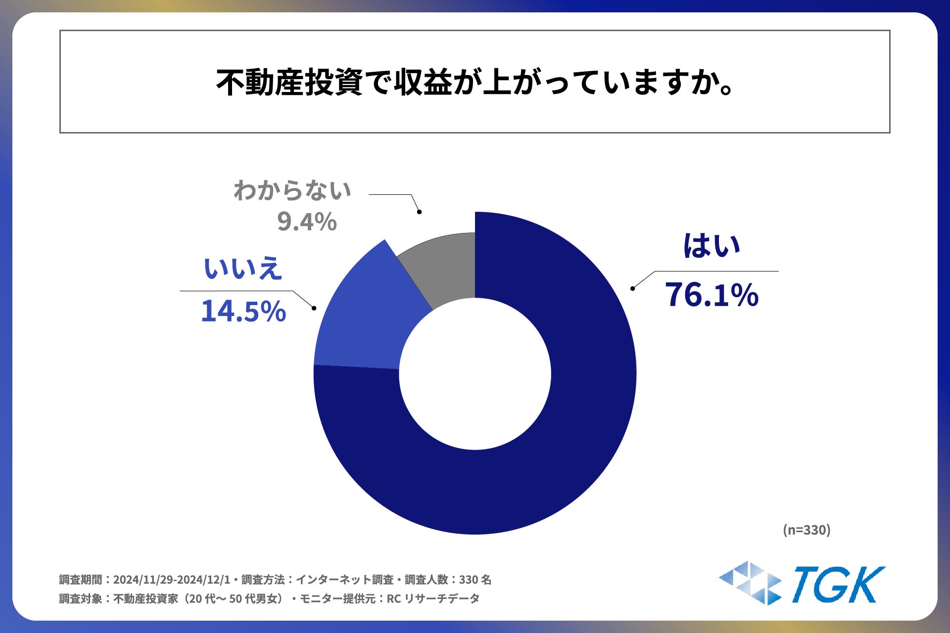 まず、「不動産投資で収益が上がっているか」を尋ねる設問への回答では「はい」が76.1%、「いいえ」が14.6%という結果になりました。この結果から20代~50代の不動産投資家の7割以上が、不動産投資で収益を上げていることがわかりました。