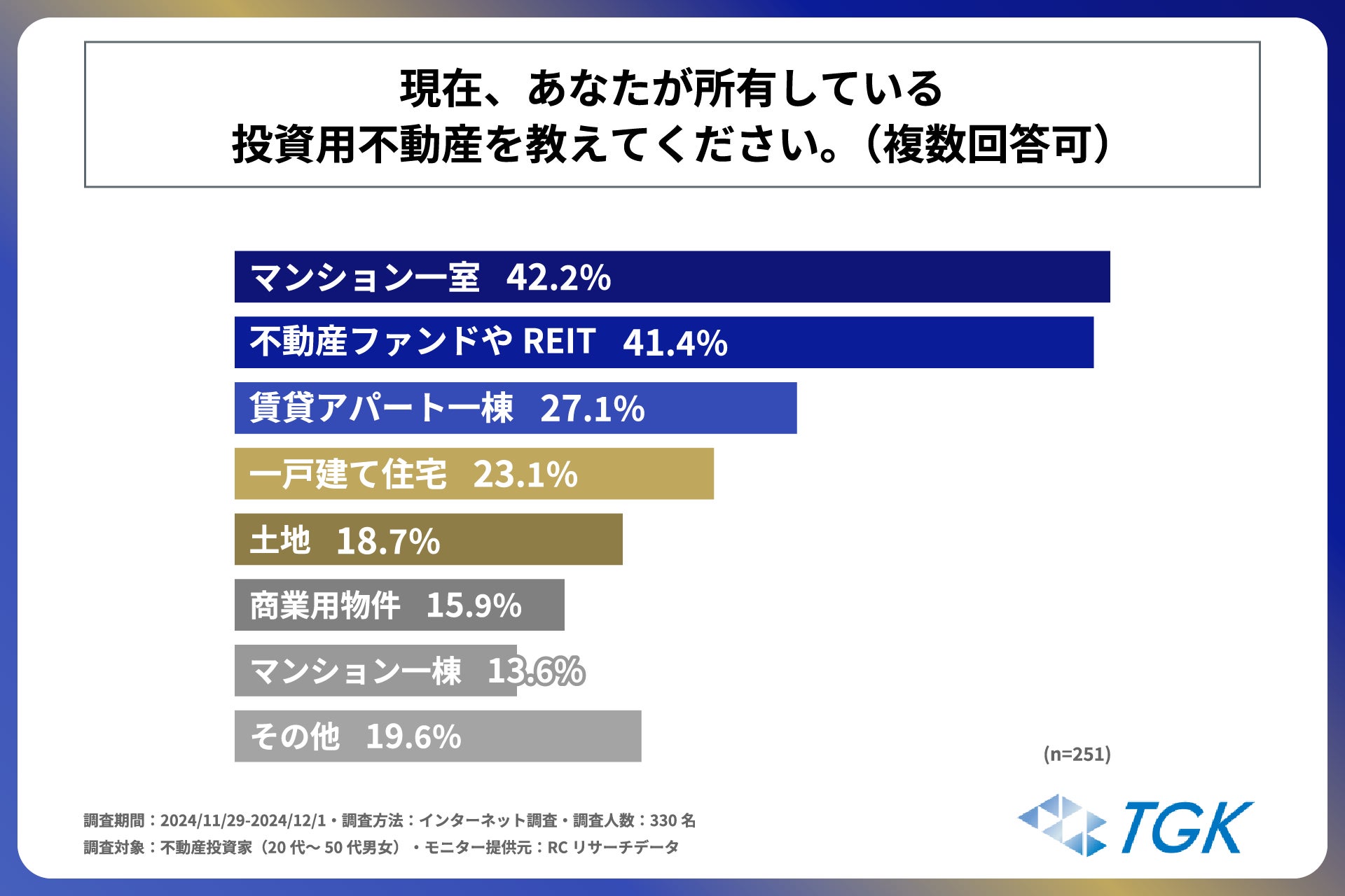 続いて、不動産投資で収益が上がっていると回答された方に「現在、所有している投資用不動産の種類」を尋ねる設問への回答では、1位が「マンション一室」で42.2%、2位が「不動産ファンドやREIT」で41.4%、3位が「賃貸アパート1棟」で27.1%という結果になりました。この結果から、不動産投資で収益を上げている不動産投資家が所有している投資用不動産で最も多いのは「マンション一室」であることが判明しました。