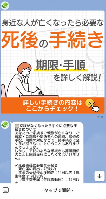 遺言書作成や家族信託、成年後見など生前対策、財産管理などに関するお役立ち情報をLINEを通じて定期的に配信(月2回)する機能です。