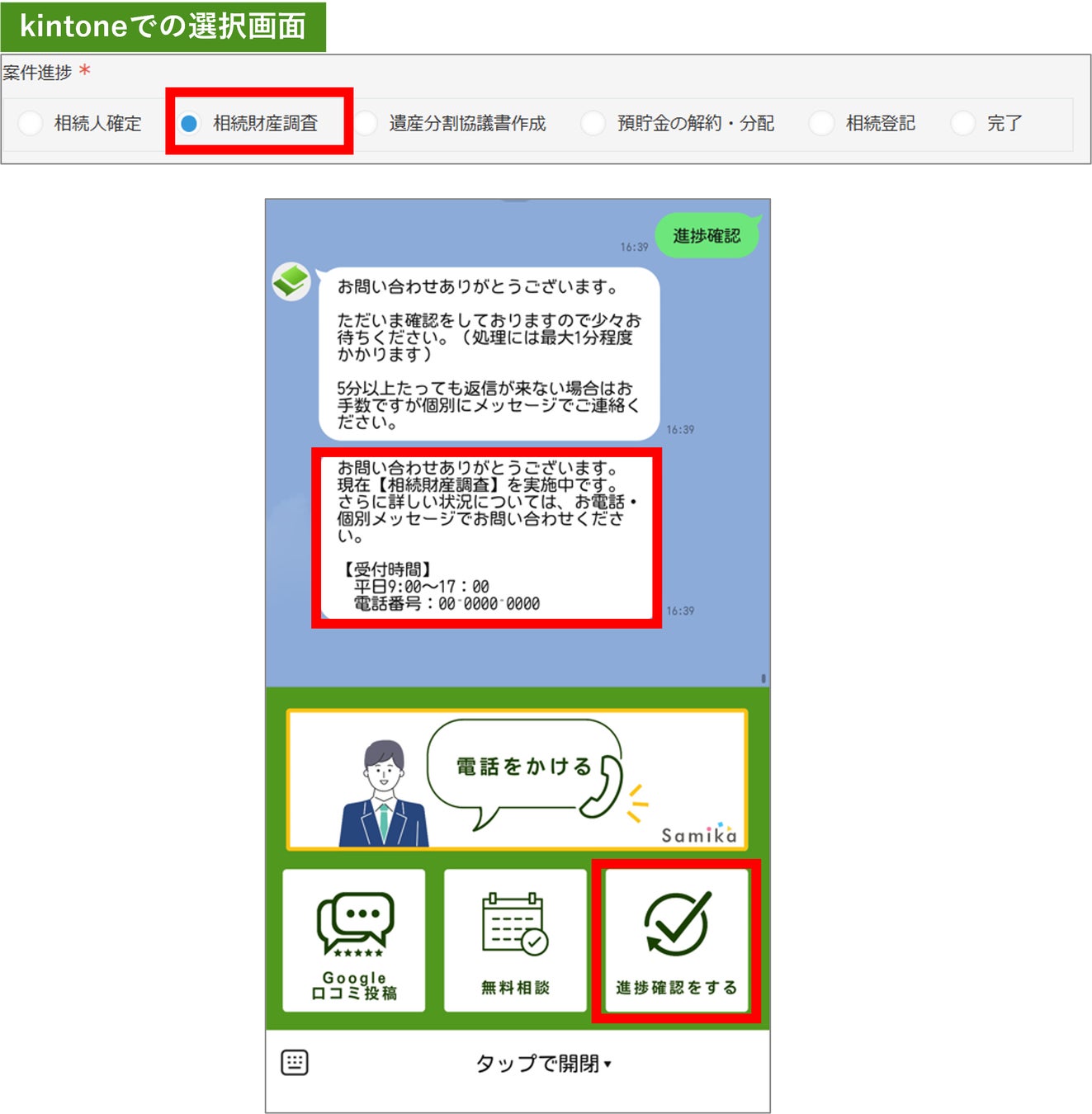 相続受任顧客からの進捗状況の確認の問い合わせに多くの時間を割かれ、業務生産性が下がっているという課題に対して、LINE上のボタンタップで、事務所の顧客CRMシステムと連動し、現在の業務進捗状況が自動返信される機能です。