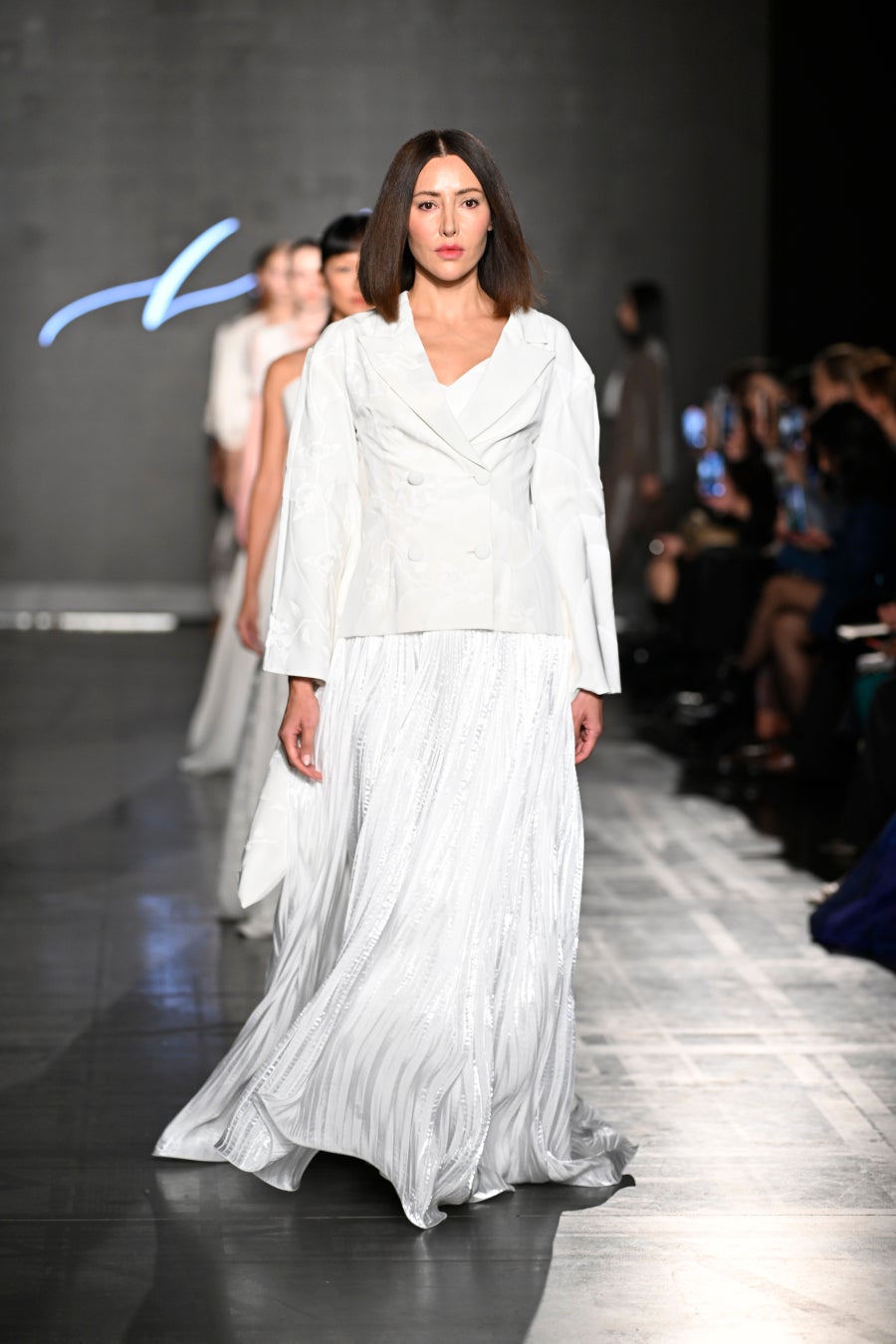 コレクションは静寂の中、“268.416412037”と映し出されスタートし、石川能登半島地震発生からランウェイ当日までの時間経過を視覚的に表現。未だ復興が十分でない被災地の現状に問題提起を投げかけつつも、 復興の兆しへの願いを込めた「白椿」加賀友禅を纏ったモデルがランウェイを進みます。加賀友禅ならではの写実的に緻密に描かれた白椿の美しさや、袖のゆらめきに、観衆は魅了されました。