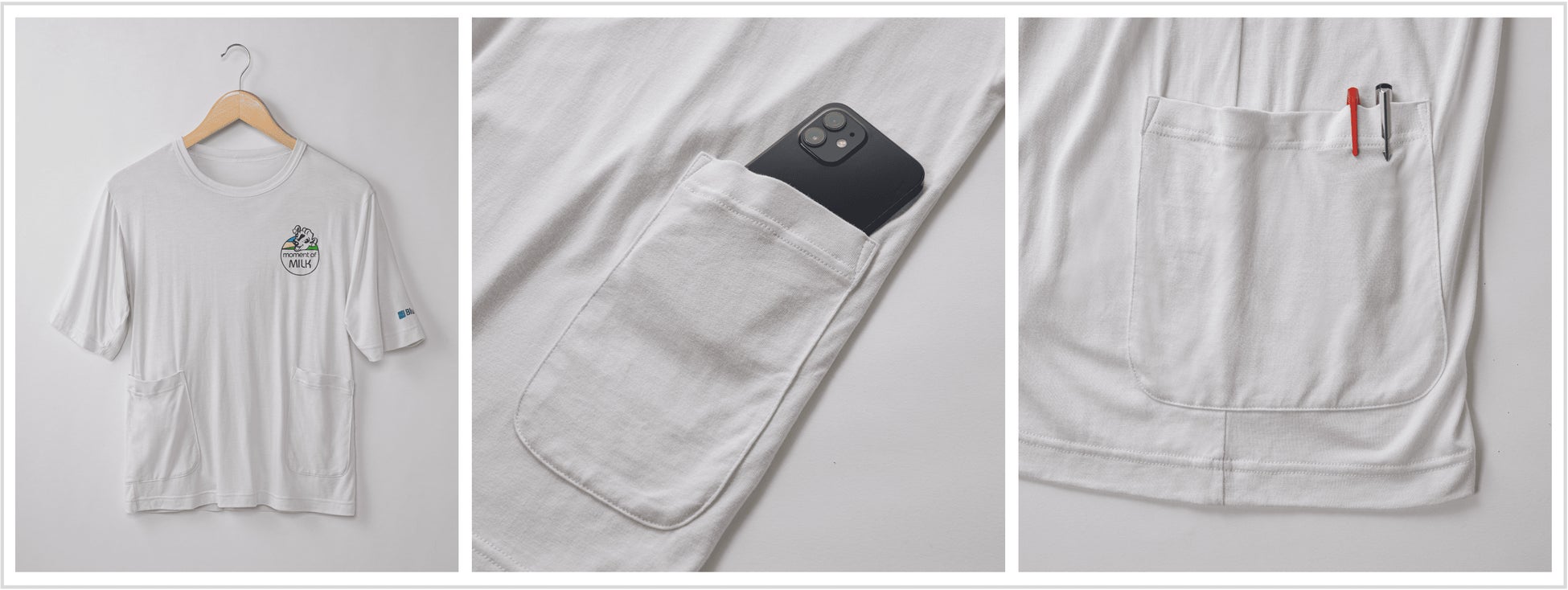 脱脂粉乳を繊維に練り込んだ、シルクのような滑らかな質感・肌触りの良さが特長のユーティリティーポケット付きクルーネックTシャツ。素材の良さはそのままに「汚れにくくて、洗濯後は素早く乾く」利便性を与えてくれるフッ素フリーのはっ水加工が施されています。スマートフォンなどの収納のしやすさを考慮したポケット付き半袖クルーネックTシャツを、動きやすさと脱着のしやすさを考慮したルーズフィットシルエットで仕上げました。