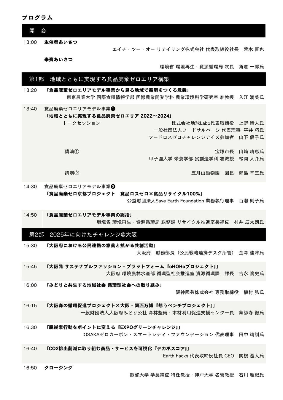 エイチ・ツー・オー リテイリング株式会社(本社:大阪市北区 代表取締役社長:荒木直也 以下、H2O)は、地域の生活者・事業者・行政が連携する資源循環の実践事例を共有し、実現に向けたアクションを考えるシンポジウムを初めて開催します。「地域とともに実現する資源循環」をテーマに、生活者に身近な衣食住での取り組み事例を、産学官の多彩なプレーヤーによる講演やトークセッションで紹介。知見やノウハウの共有を通して、生活者の意識・行動の変容につながる取り組みのあり方を伝えるとともに、参加者のネットワーク形成を図ります。