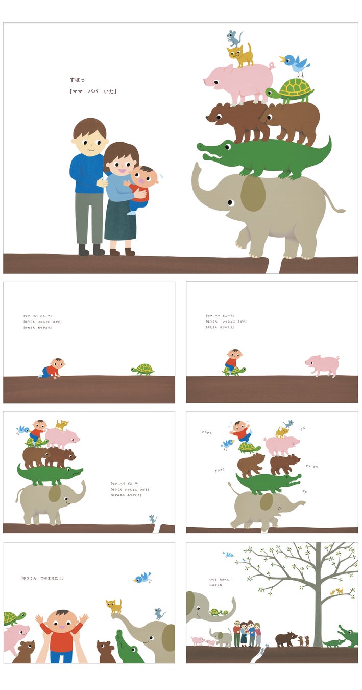 そこに次から次へと色々な動物が登場し、協力して一緒にママとパパを探します。