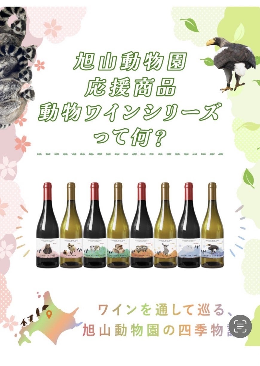 「旭山動物園 応援商品 動物ワインシリーズ」は、年間8種類 2種1セット(各750ml)税込6,600円のワインを年間4回に分けてネットや店頭で販売。ワインは、国内外の選抜された原料を使用し、自社畑の酵母を培養してして使用するものもあり、保存料、化学物質等をできる限り使用しない方法で醸造しました。