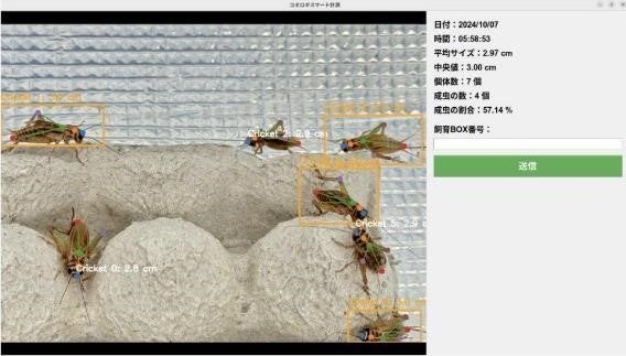 システムでコオロギの成長を管理・識別することで最適なエサの量や水の量を算出し効率的なコオロギの生産を可能とします。
